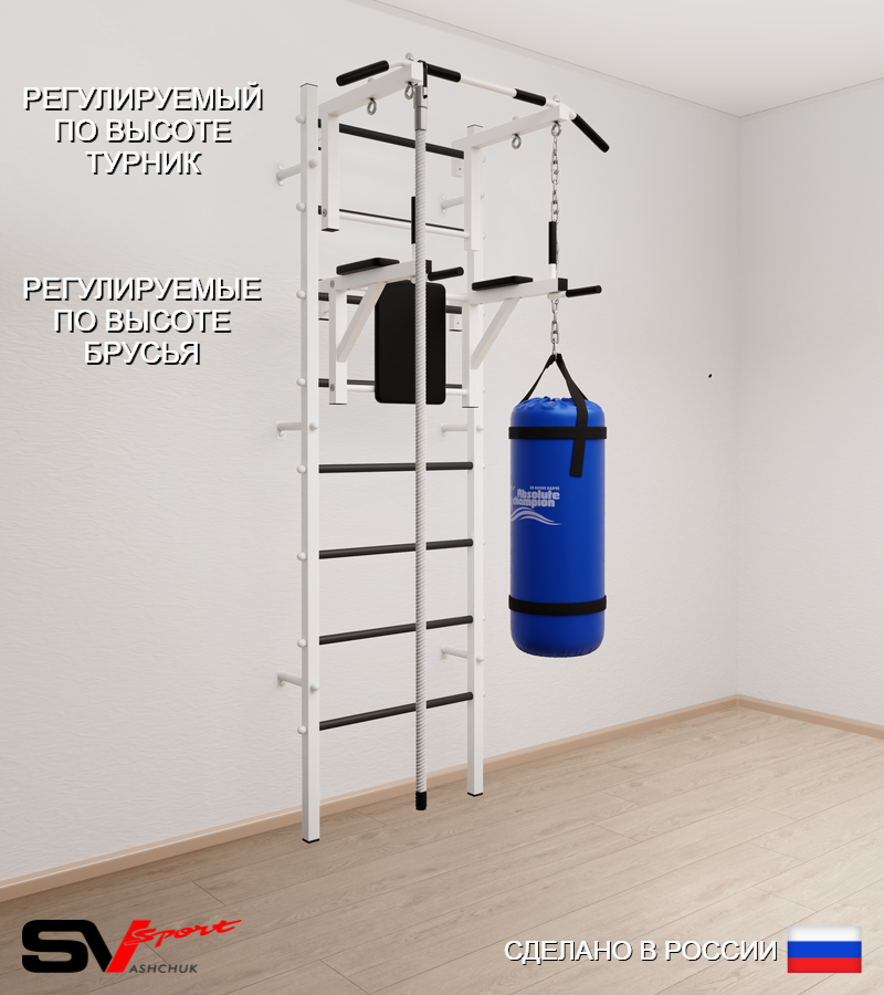 КОМПЛЕКТАЦИЯ: Шведская стенка Sv Sport (профиль вертикальных стоек 40 х 40 х 2 мм), Турник Sv Sport стандарт к ШС, Брусья Sv Sport к ШС, Kанат, Цепь удлинитель 90см, Мешок боксерский 15кг.