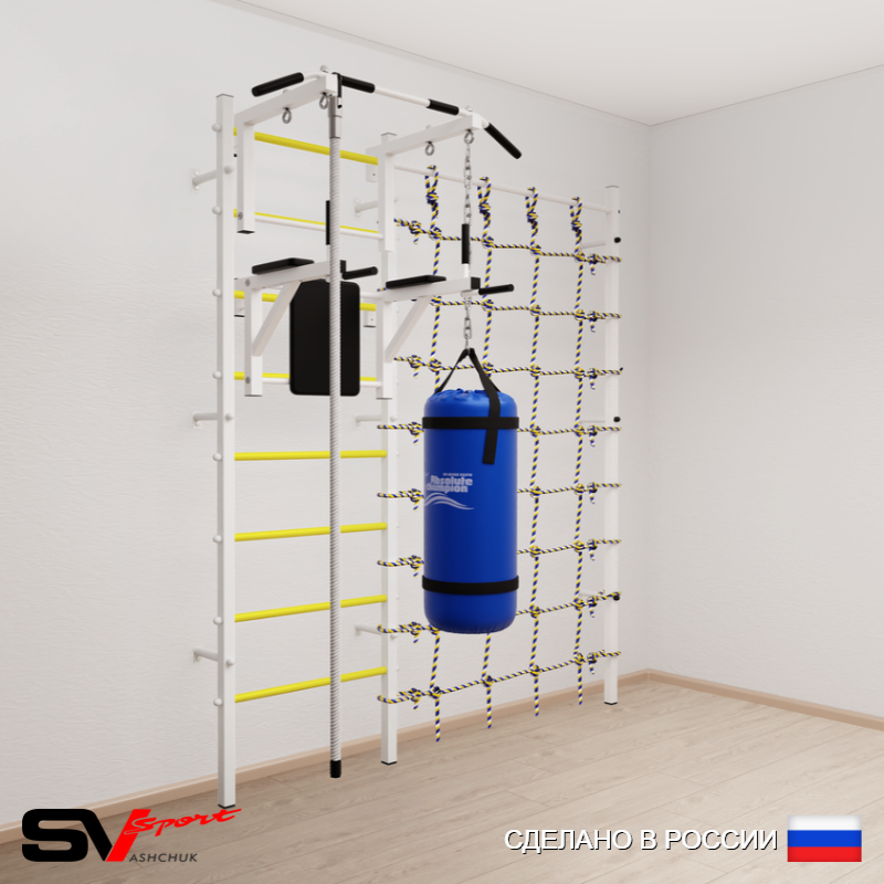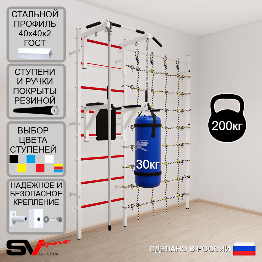 КОМПЛЕКТАЦИЯ: Шведская стенка Sv Sport (профиль вертикальных стоек 40 х 40 х 2 мм), Турник Sv Sport стандарт к ШС, Брусья Sv Sport к ШС, Kанат, Цепь удлинитель 90см, Мешок боксерский 30кг, Канатный лаз.