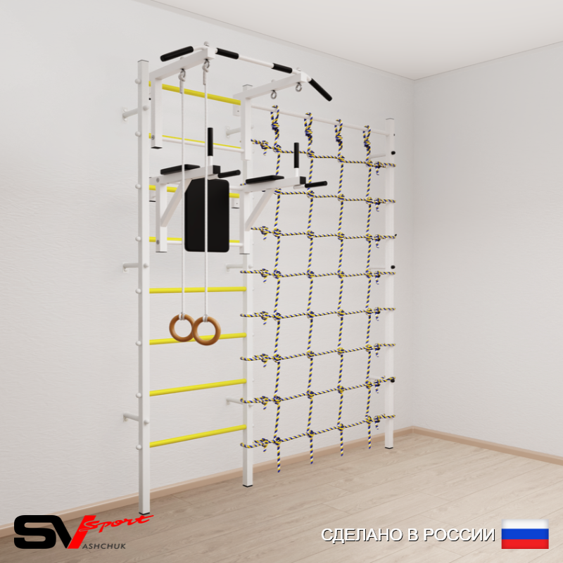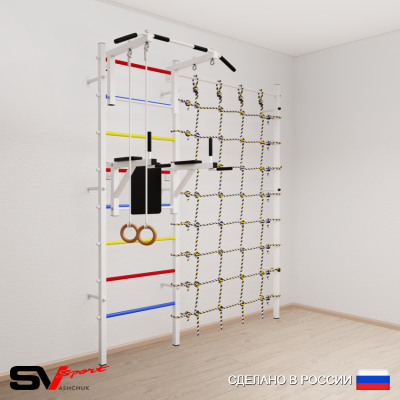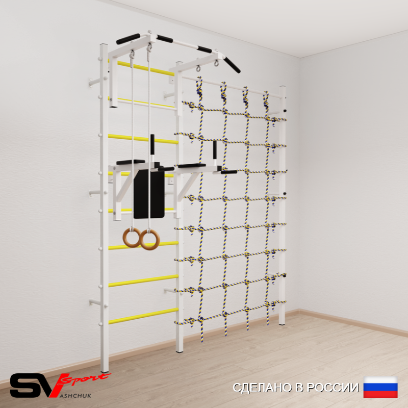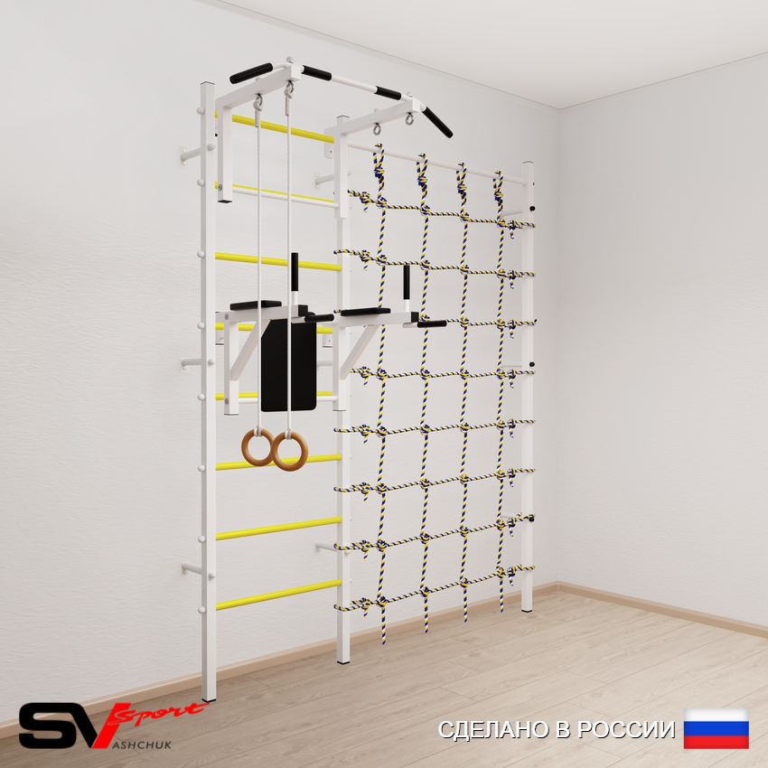 КОМПЛЕКТАЦИЯ: Шведская стенка Sv Sport (профиль вертикальных стоек 40 х 40 х 2 мм), Турник Sv Sport стандарт к ШС, Брусья Sv Sport к ШС, Kольца деревянные, Канатный лаз.