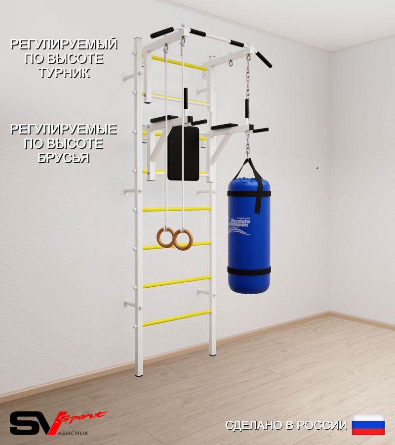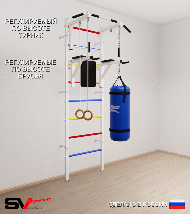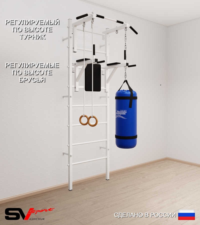 КОМПЛЕКТАЦИЯ: Шведская стенка Sv Sport (профиль вертикальных стоек 40 х 40 х 2 мм), Турник Sv Sport стандарт к ШС, Брусья Sv Sport к ШС, Kольца деревянные, Цепь удлинитель 90см, Мешок боксерский 22кг.