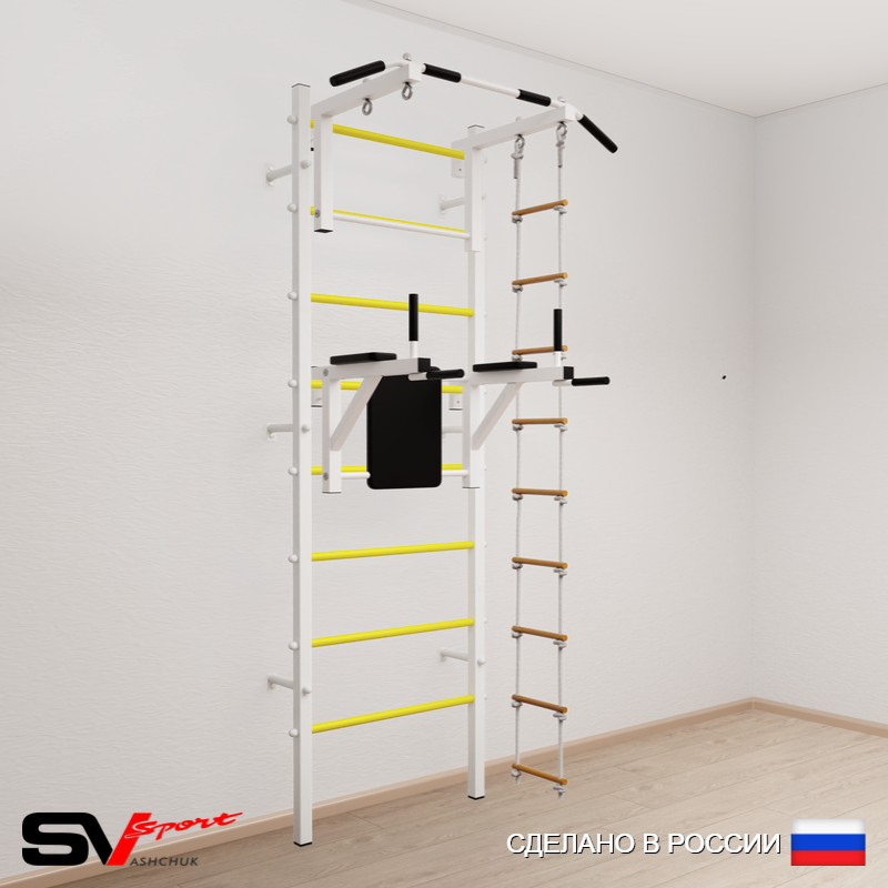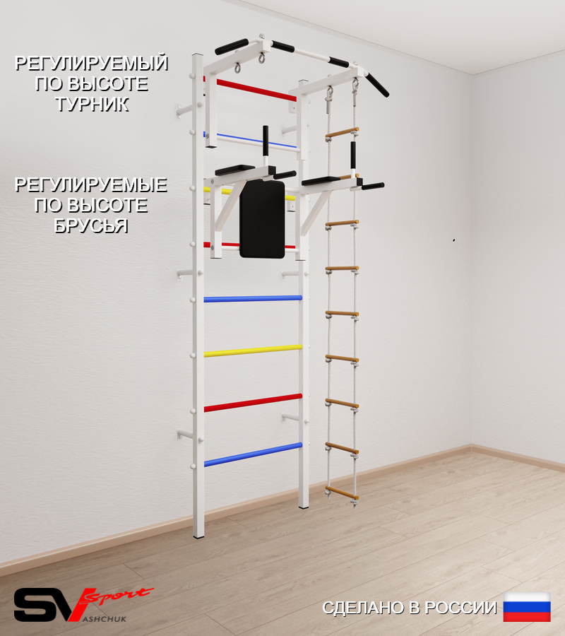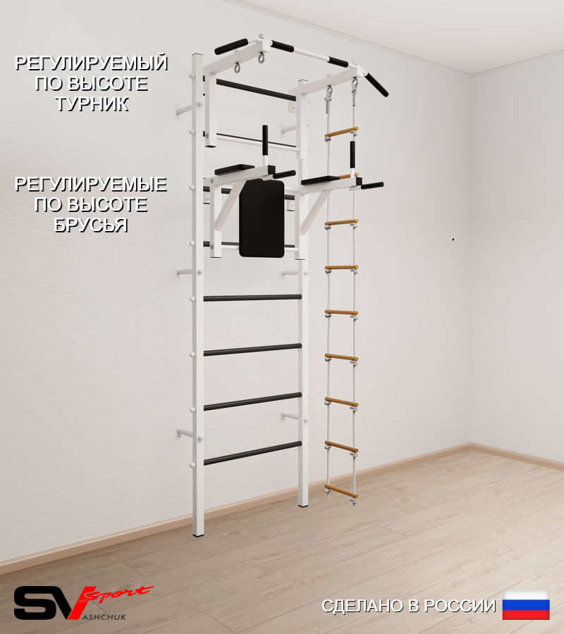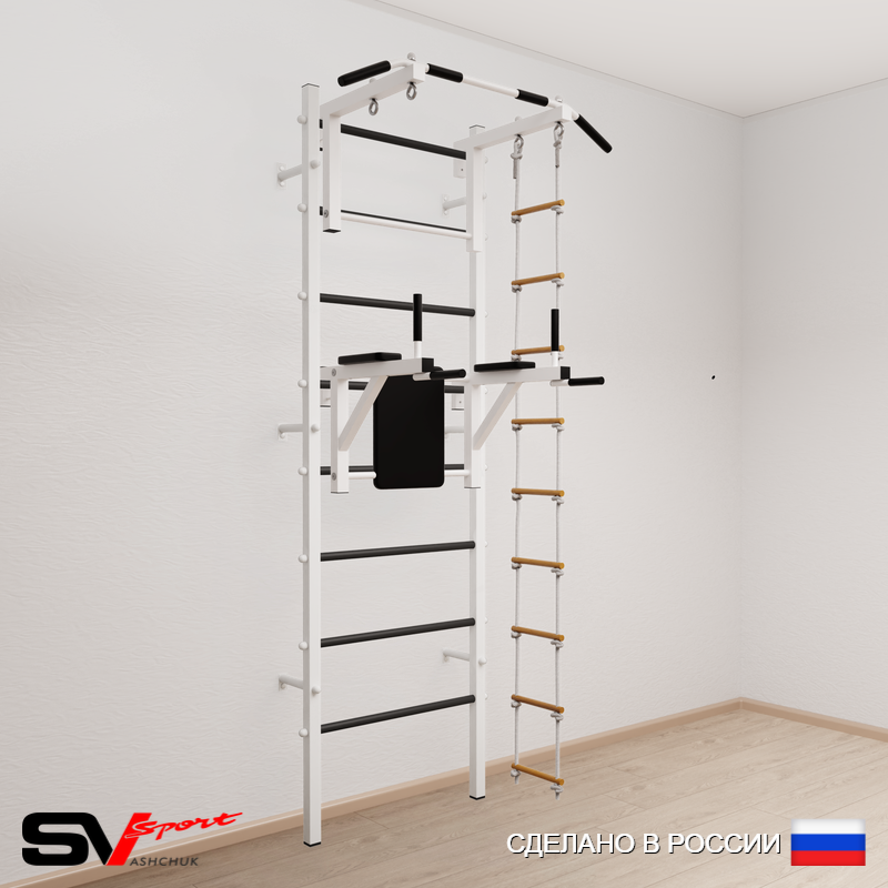КОМПЛЕКТАЦИЯ: Шведская стенка Sv Sport (профиль вертикальных стоек 40 х 40 х 2 мм), Турник Sv Sport стандарт к ШС, Брусья Sv Sport к ШС, Лестница веревочная.