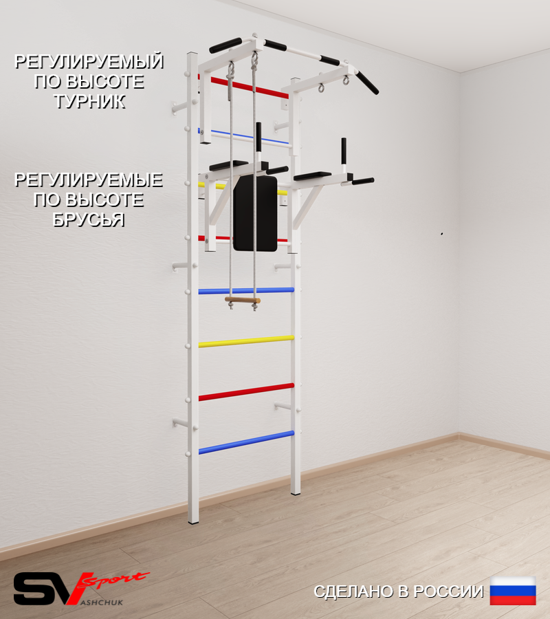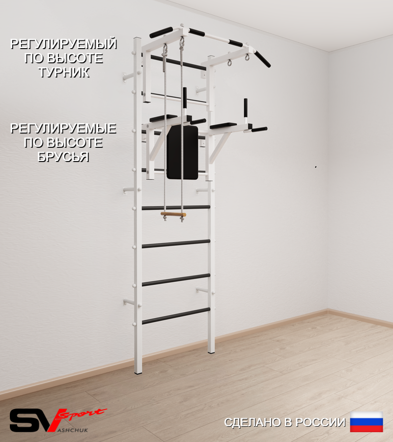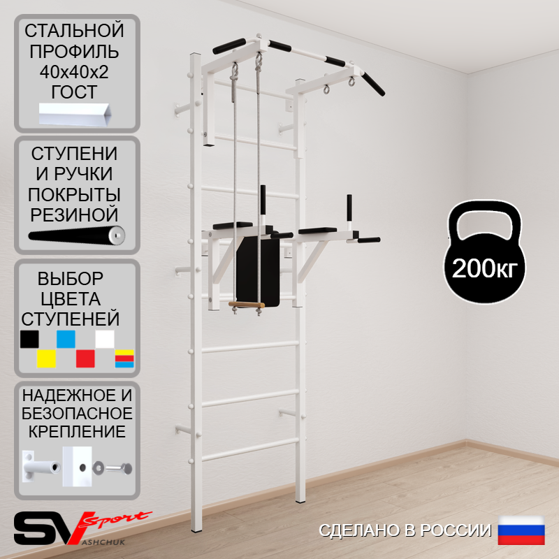 КОМПЛЕКТАЦИЯ: Шведская стенка Sv Sport (профиль вертикальных стоек 40 х 40 х 2 мм), Турник Sv Sport стандарт к ШС, Брусья Sv Sport к ШС, Трапеция.
