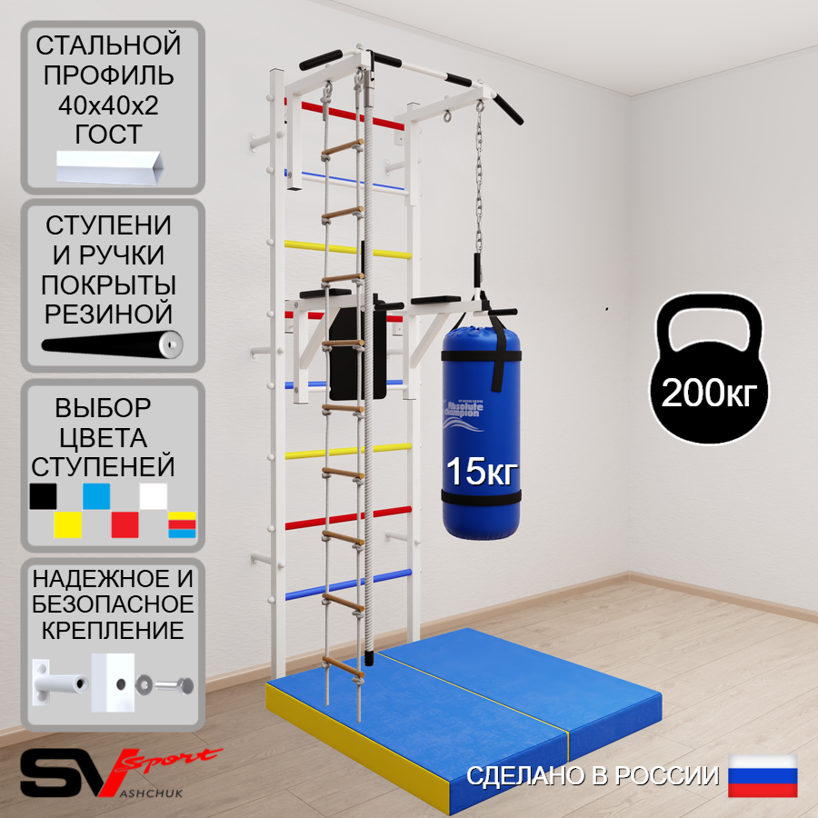 КОМПЛЕКТАЦИЯ: Шведская стенка Sv Sport (профиль вертикальных стоек 40 х 40 х 2 мм), Турник Sv Sport стандарт к ШС, Брусья Sv Sport к ШС, Kанат, Лестница веревочная, Цепь удлинитель 90см, Мешок боксерский 15кг, Спортивный мат 100 х 100 х 10 см складной.