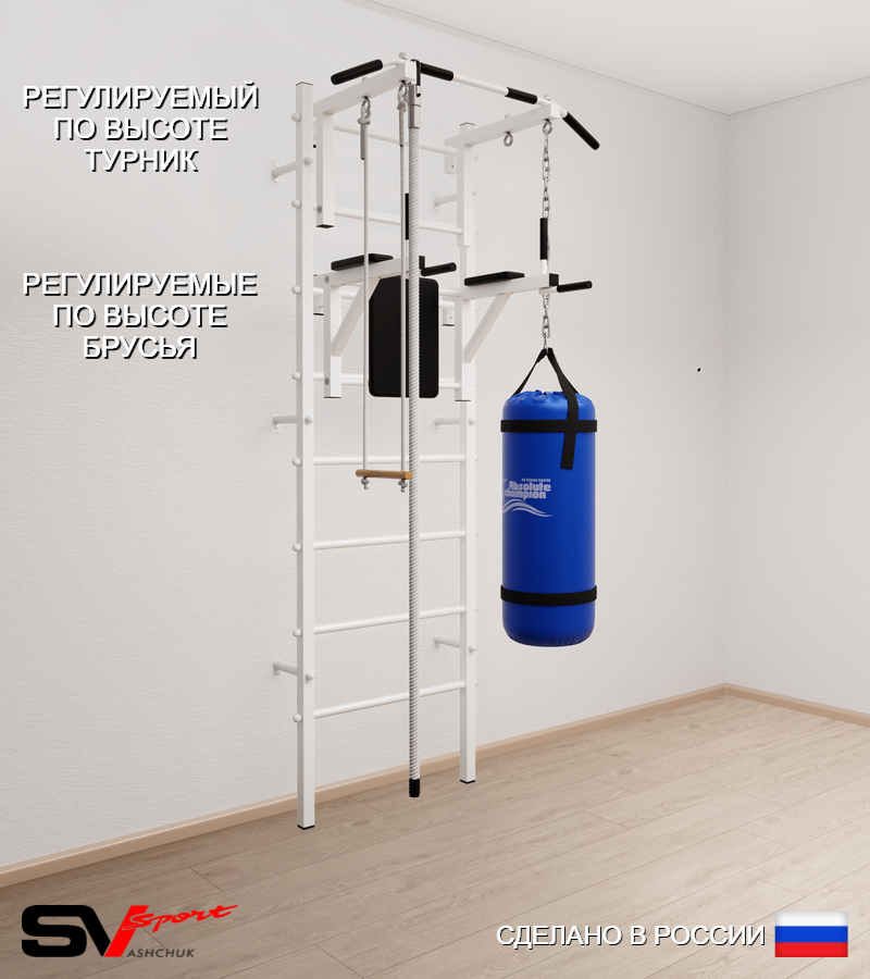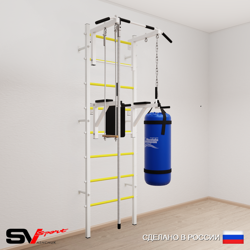 КОМПЛЕКТАЦИЯ: Шведская стенка Sv Sport (профиль вертикальных стоек 40 х 40 х 2 мм), Турник Sv Sport стандарт к ШС, Брусья Sv Sport к ШС, Kанат, Трапеция, Цепь удлинитель 90см, Мешок боксерский 22кг.