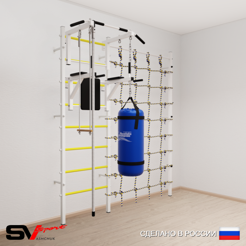 КОМПЛЕКТАЦИЯ: Шведская стенка Sv Sport (профиль вертикальных стоек 40 х 40 х 2 мм), Турник Sv Sport стандарт к ШС, Брусья Sv Sport к ШС, Kанат, Трапеция, Цепь удлинитель 90см, Мешок боксерский 30кг, Канатный лаз.