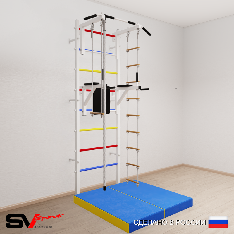 КОМПЛЕКТАЦИЯ: Шведская стенка Sv Sport (профиль вертикальных стоек 40 х 40 х 2 мм), Турник Sv Sport стандарт к ШС, Брусья Sv Sport к ШС, Kанат, Трапеция, Лестница веревочная, Спортивный мат 100 х 100 х 10 см складной.
