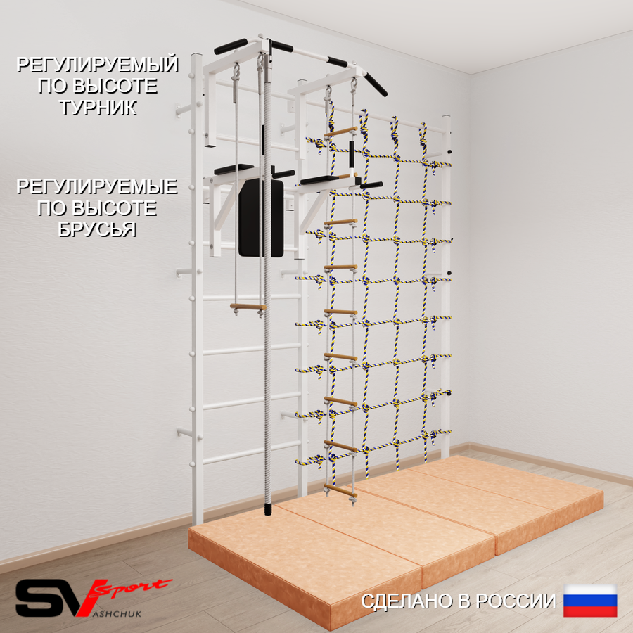 КОМПЛЕКТАЦИЯ: Шведская стенка Sv Sport (профиль вертикальных стоек 40 х 40 х 2 мм), Турник Sv Sport стандарт к ШС, Брусья Sv Sport к ШС, Kанат, Трапеция, Лестница веревочная, Спортивный мат 100 х 200 х 10 см складной, Канатный лаз.