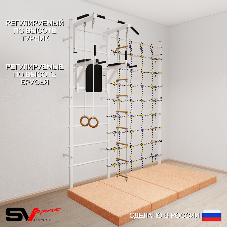 КОМПЛЕКТАЦИЯ: Шведская стенка Sv Sport (профиль вертикальных стоек 40 х 40 х 2 мм), Турник Sv Sport стандарт к ШС, Брусья Sv Sport к ШС, Kольца деревянные, Лестница веревочная, Спортивный мат 100 х 200 х 10 см складной, Канатный лаз.