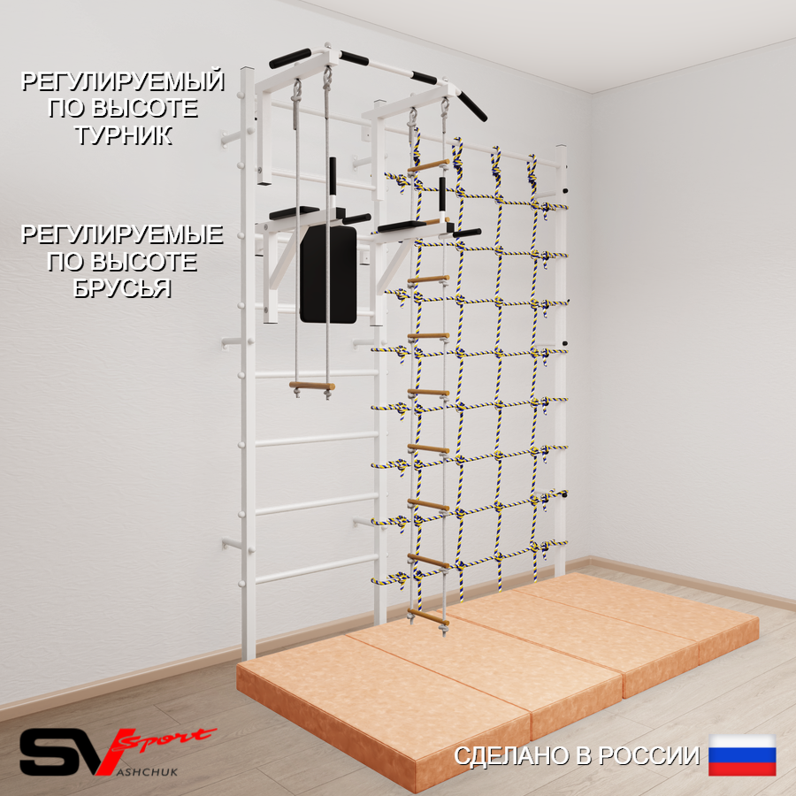 КОМПЛЕКТАЦИЯ: Шведская стенка Sv Sport (профиль вертикальных стоек 40 х 40 х 2 мм), Турник Sv Sport стандарт к ШС, Брусья Sv Sport к ШС, Трапеция, Лестница веревочная, Спортивный мат 100 х 200 х 10 см складной, Канатный лаз.
