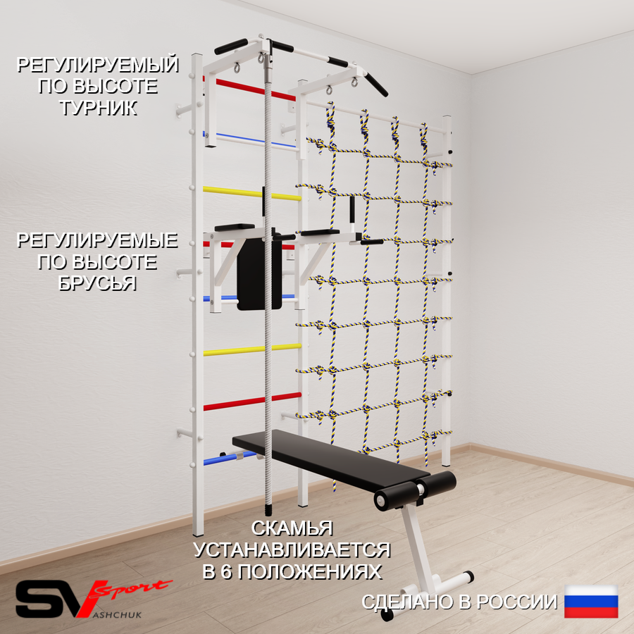 КОМПЛЕКТАЦИЯ: Шведская стенка Sv Sport (профиль вертикальных стоек 40 х 40 х 2 мм), Турник Sv Sport стандарт к ШС, Брусья Sv Sport к ШС, Скамья для пресса и жима Sv Sport к ШС, Kанат, Канатный лаз.