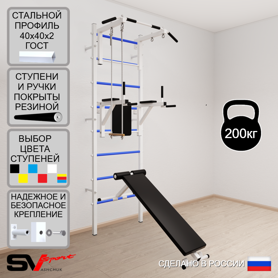КОМПЛЕКТАЦИЯ: Шведская стенка Sv Sport (профиль вертикальных стоек 40 х 40 х 2 мм), Турник Sv Sport стандарт к ШС, Брусья Sv Sport к ШС, Скамья для пресса и жима Sv Sport к ШС, Трапеция.