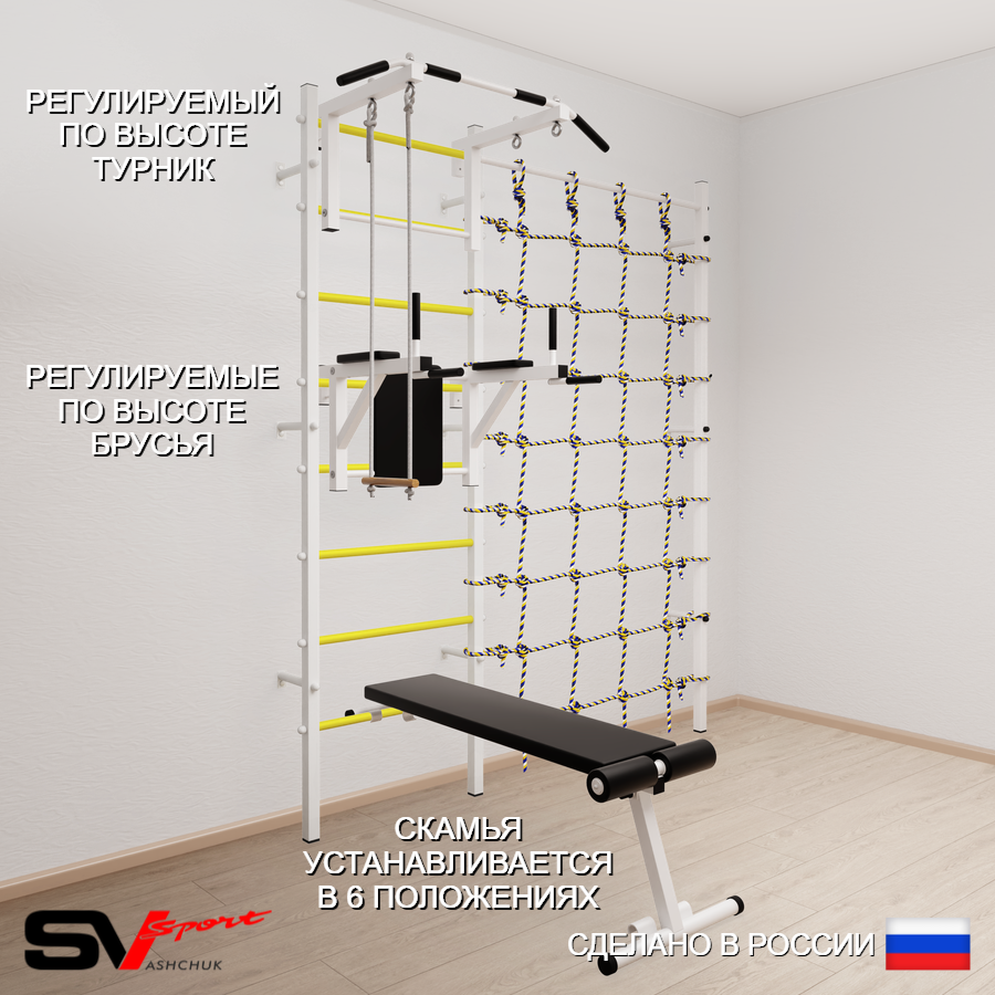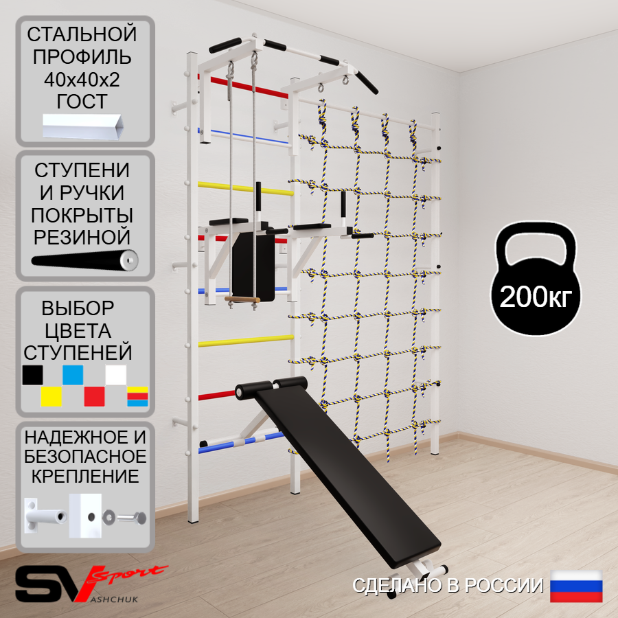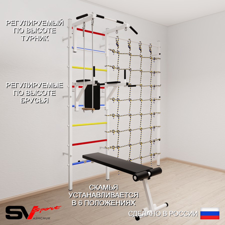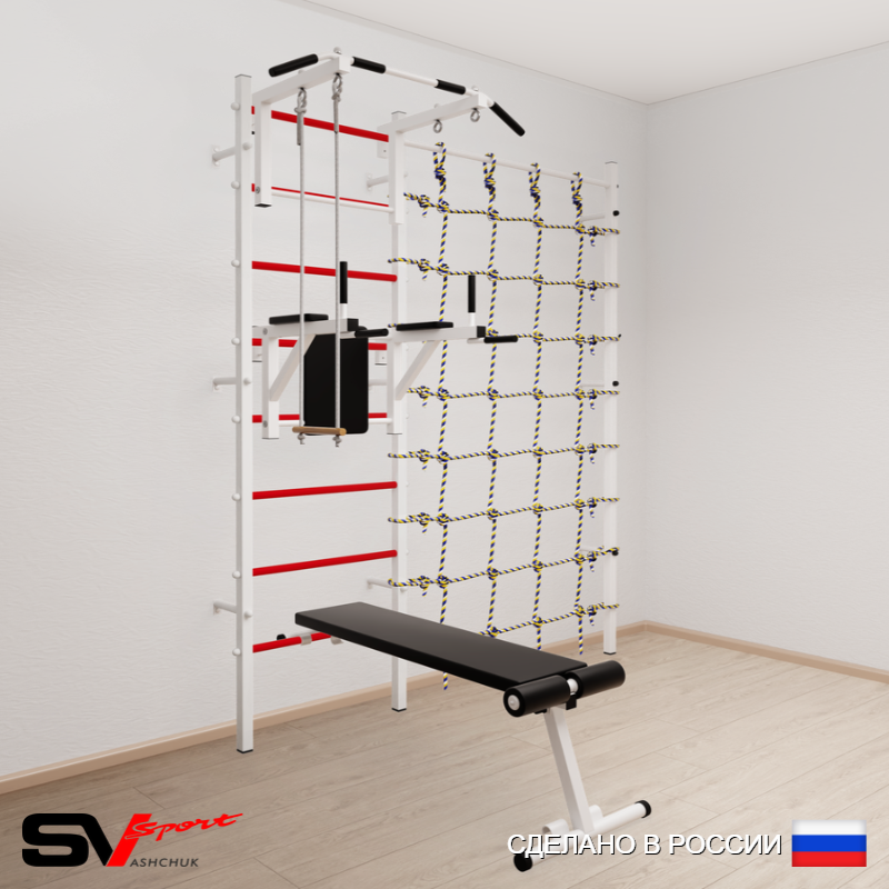 КОМПЛЕКТАЦИЯ: Шведская стенка Sv Sport (профиль вертикальных стоек 40 х 40 х 2 мм), Турник Sv Sport стандарт к ШС, Брусья Sv Sport к ШС, Скамья для пресса и жима Sv Sport к ШС, Трапеция, Канатный лаз.