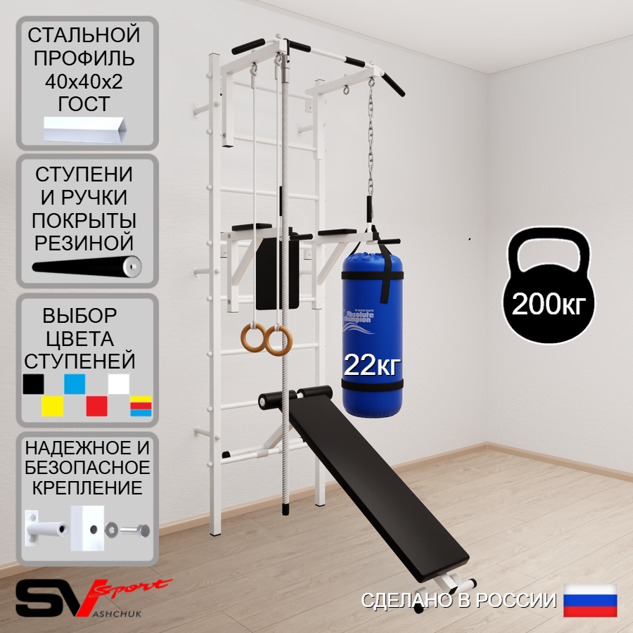 КОМПЛЕКТАЦИЯ: Шведская стенка Sv Sport (профиль вертикальных стоек 40 х 40 х 2 мм), Турник Sv Sport стандарт к ШС, Брусья Sv Sport к ШС, Скамья для пресса и жима Sv Sport к ШС, Kанат, Kольца деревянные, Цепь удлинитель 90см, Мешок боксерский 22кг.