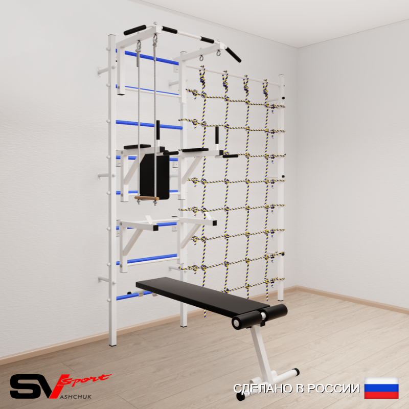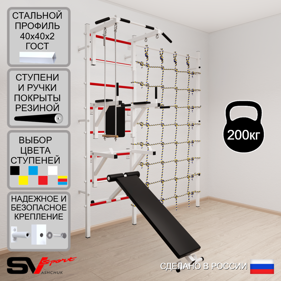 КОМПЛЕКТАЦИЯ: Шведская стенка Sv Sport (профиль вертикальных стоек 40 х 40 х 2 мм), Турник Sv Sport стандарт к ШС, Брусья Sv Sport к ШС, Стойка под штангу Sv Sport к ШС, Скамья для пресса и жима Sv Sport к ШС, Трапеция, Канатный лаз.