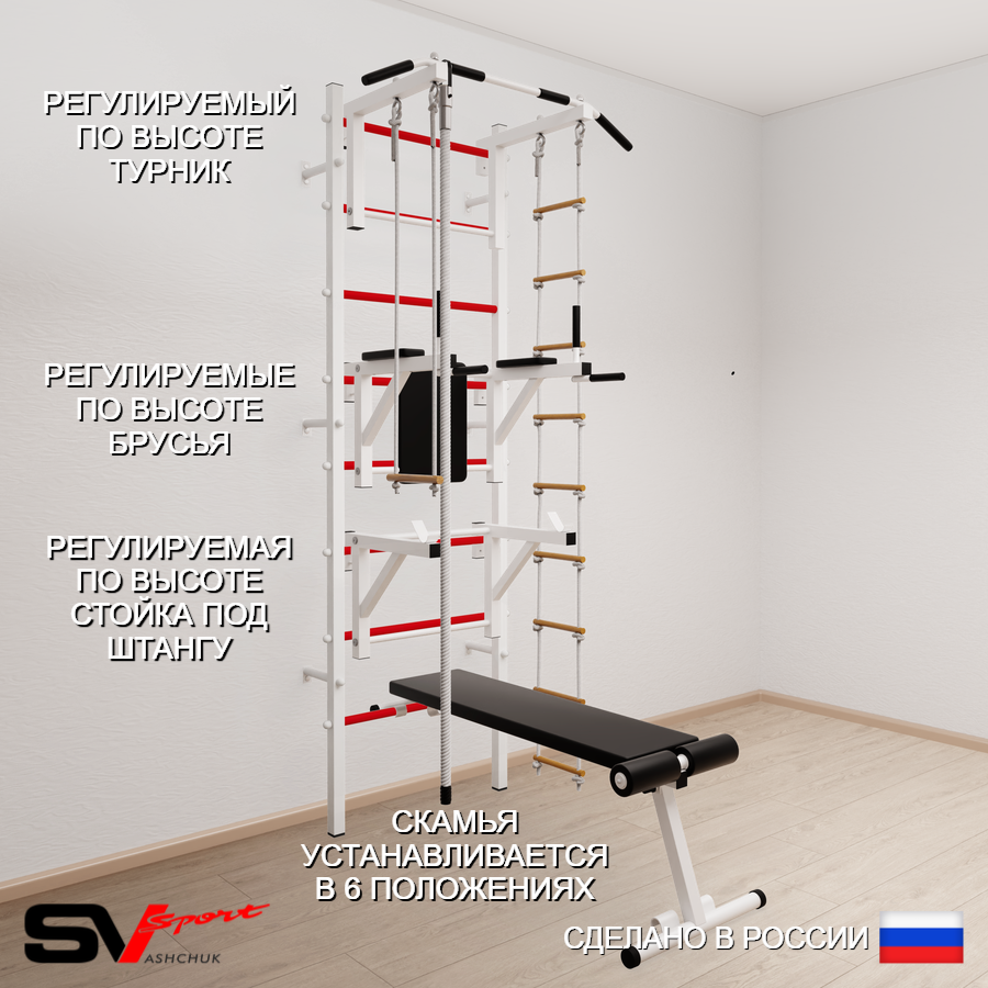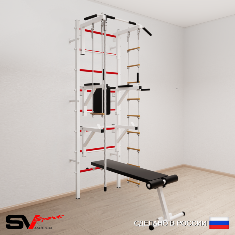 КОМПЛЕКТАЦИЯ: Шведская стенка Sv Sport (профиль вертикальных стоек 40 х 40 х 2 мм), Турник Sv Sport стандарт к ШС, Брусья Sv Sport к ШС, Стойка под штангу Sv Sport к ШС, Скамья для пресса и жима Sv Sport к ШС, Kанат, Трапеция, Лестница веревочная.