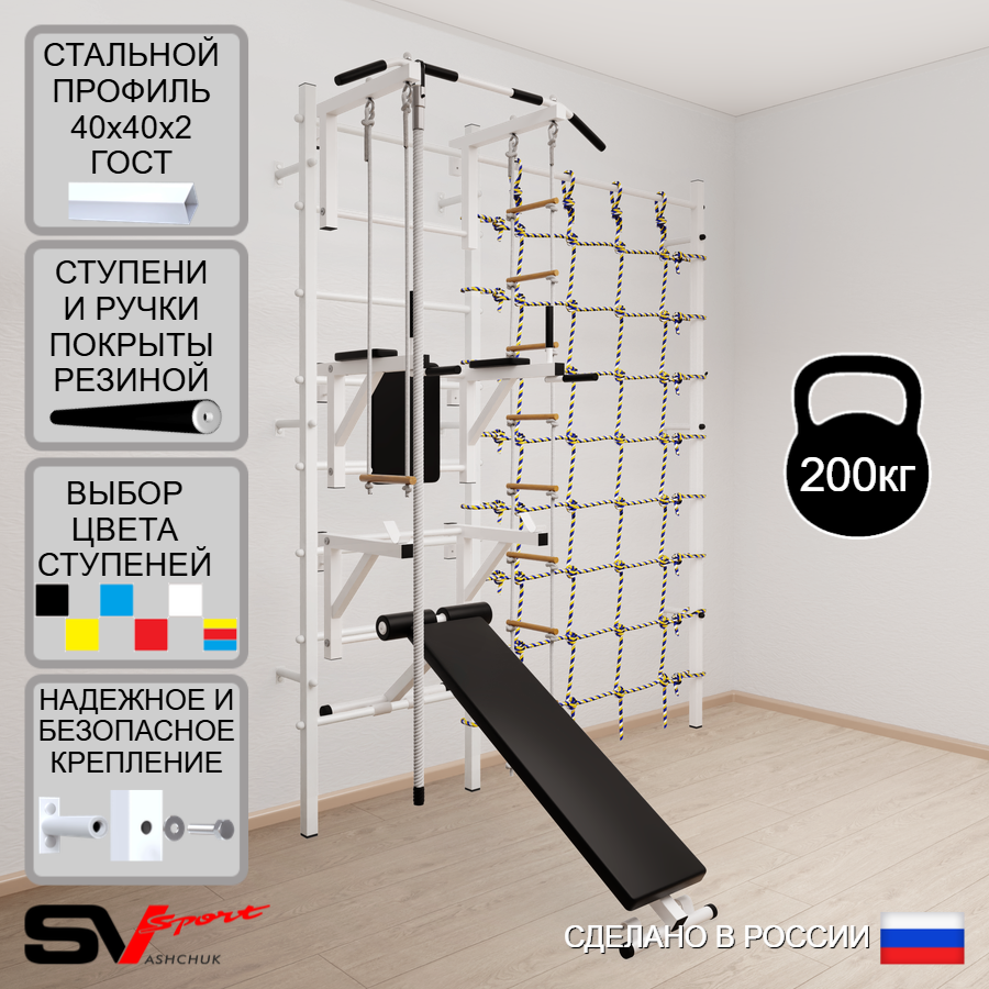 КОМПЛЕКТАЦИЯ: Шведская стенка Sv Sport (профиль вертикальных стоек 40 х 40 х 2 мм), Турник Sv Sport стандарт к ШС, Брусья Sv Sport к ШС, Стойка под штангу Sv Sport к ШС, Скамья для пресса и жима Sv Sport к ШС, Kанат, Трапеция, Лестница веревочная, Канатный лаз.