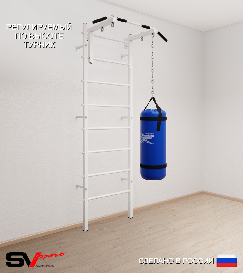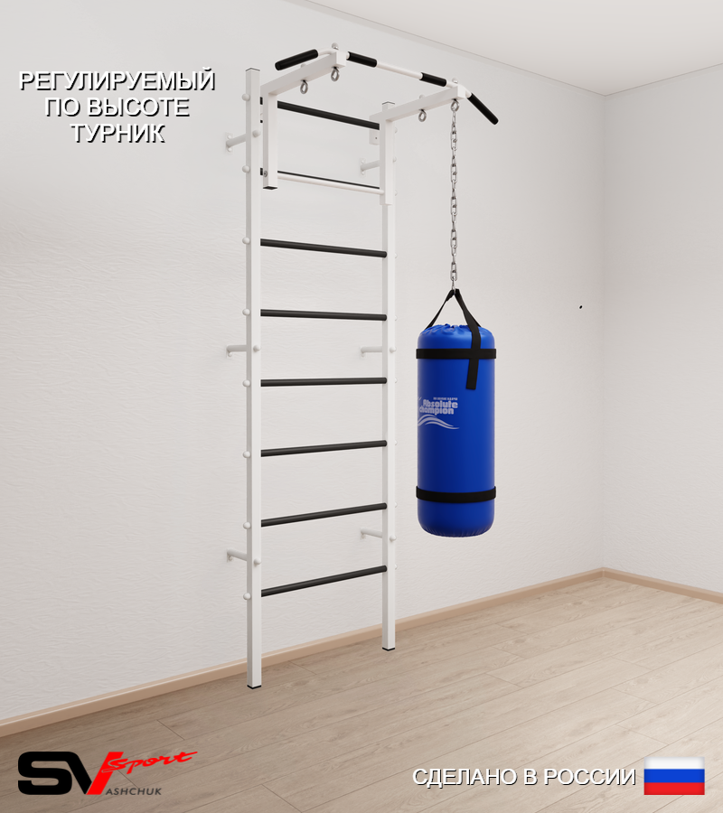 КОМПЛЕКТАЦИЯ: Шведская стенка Sv Sport усиленная (профиль вертикальных стоек 60 х 40 х 2 мм), Турник Sv Sport стандарт к ШС, Цепь удлинитель 90см, Мешок боксерский 30кг.