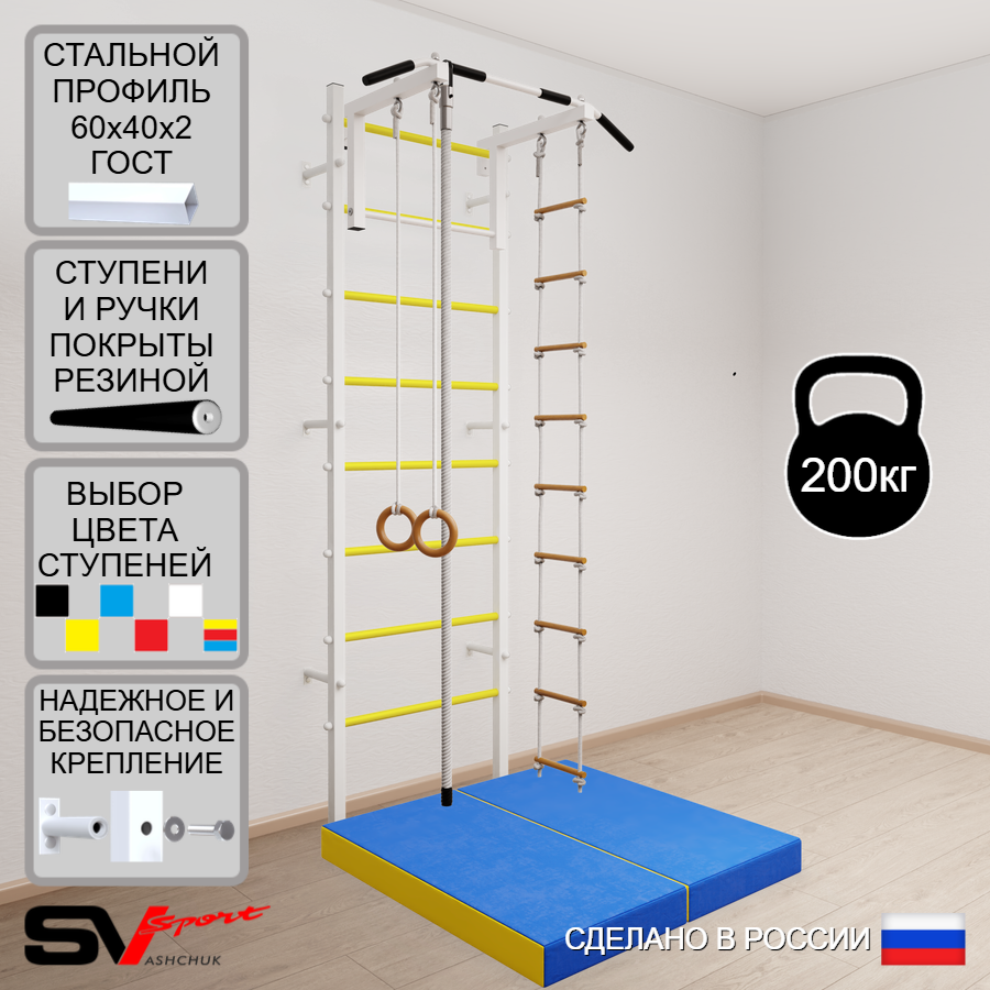 КОМПЛЕКТАЦИЯ: Шведская стенка Sv Sport усиленная (профиль вертикальных стоек 60 х 40 х 2 мм), Турник Sv Sport стандарт к ШС, Kанат, Kольца деревянные, Лестница веревочная, Спортивный мат 100 х 100 х 10 см складной.