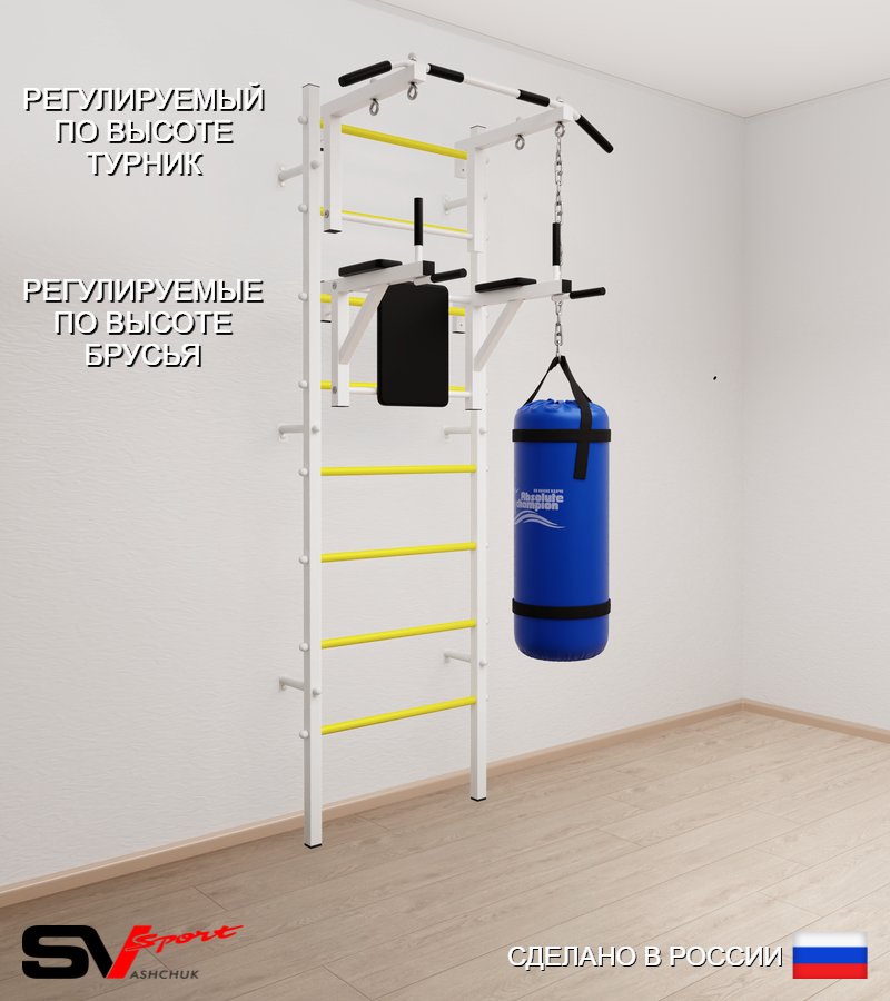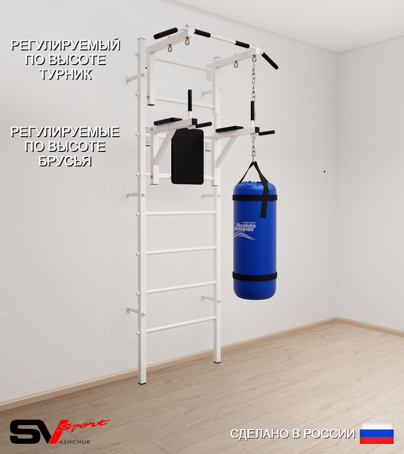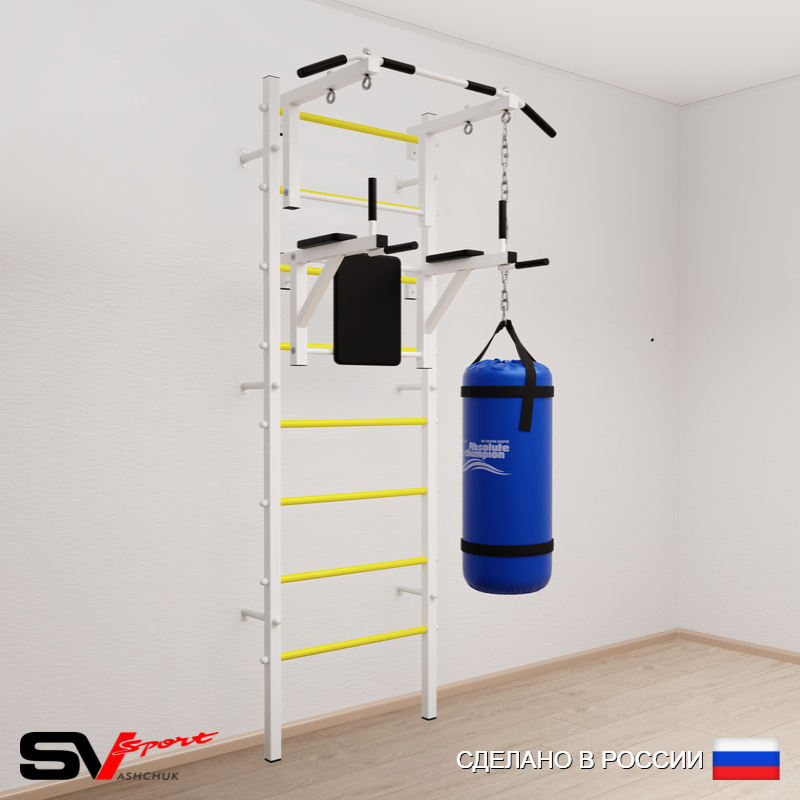 КОМПЛЕКТАЦИЯ: Шведская стенка Sv Sport усиленная (профиль вертикальных стоек 60 х 40 х 2 мм), Турник Sv Sport стандарт к ШС, Брусья Sv Sport к ШС, Цепь удлинитель 90см, Мешок боксерский 22кг.