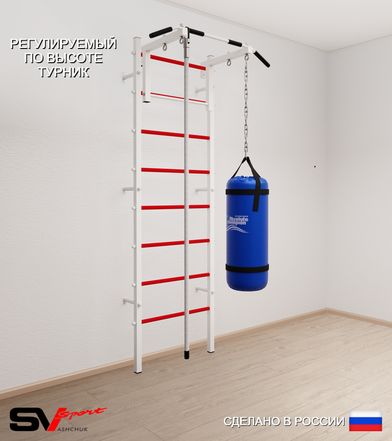КОМПЛЕКТАЦИЯ: Шведская стенка Sv Sport усиленная (профиль вертикальных стоек 60 х 40 х 2 мм), Турник Sv Sport стандарт к ШС, Kанат, Цепь удлинитель 90см, Мешок боксерский 22кг.