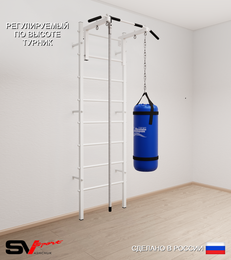 КОМПЛЕКТАЦИЯ: Шведская стенка Sv Sport усиленная (профиль вертикальных стоек 60 х 40 х 2 мм), Турник Sv Sport стандарт к ШС, Kанат, Цепь удлинитель 90см, Мешок боксерский 30кг.