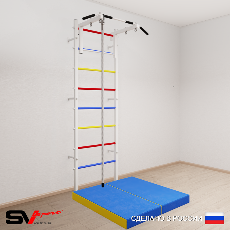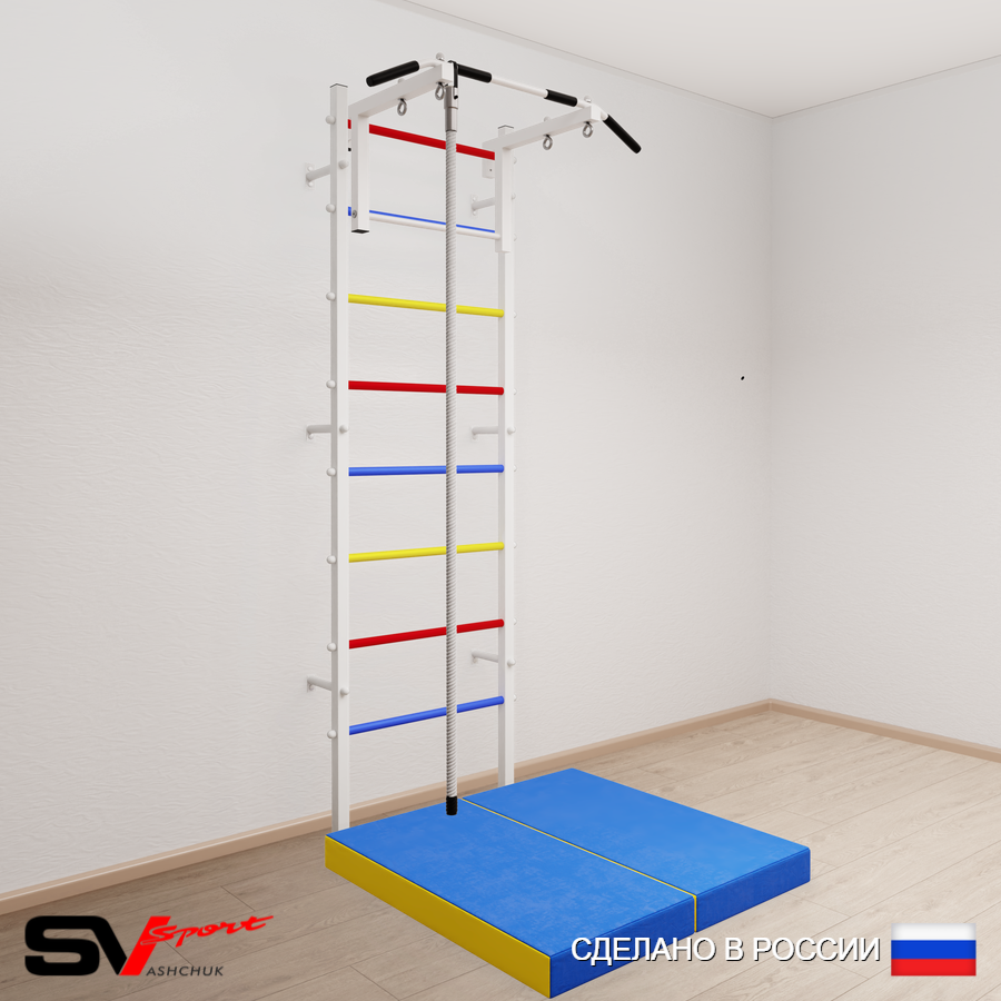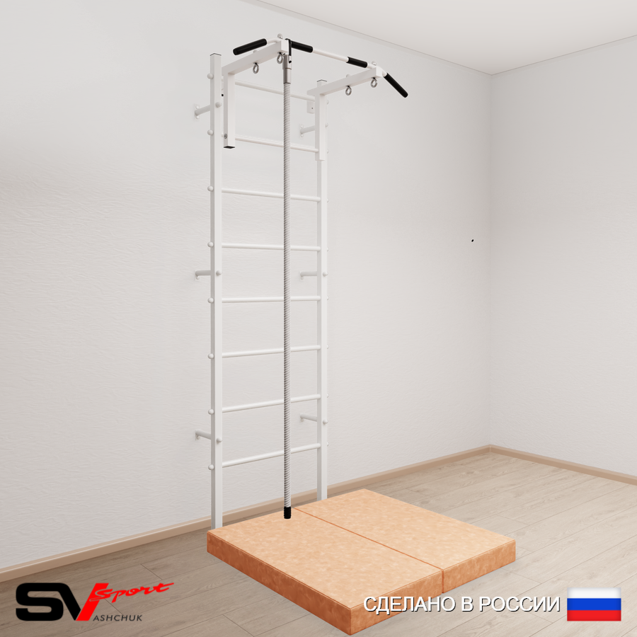 КОМПЛЕКТАЦИЯ: Шведская стенка Sv Sport усиленная (профиль вертикальных стоек 60 х 40 х 2 мм), Турник Sv Sport стандарт к ШС, Kанат, Спортивный мат 100 х 100 х 10 см складной.