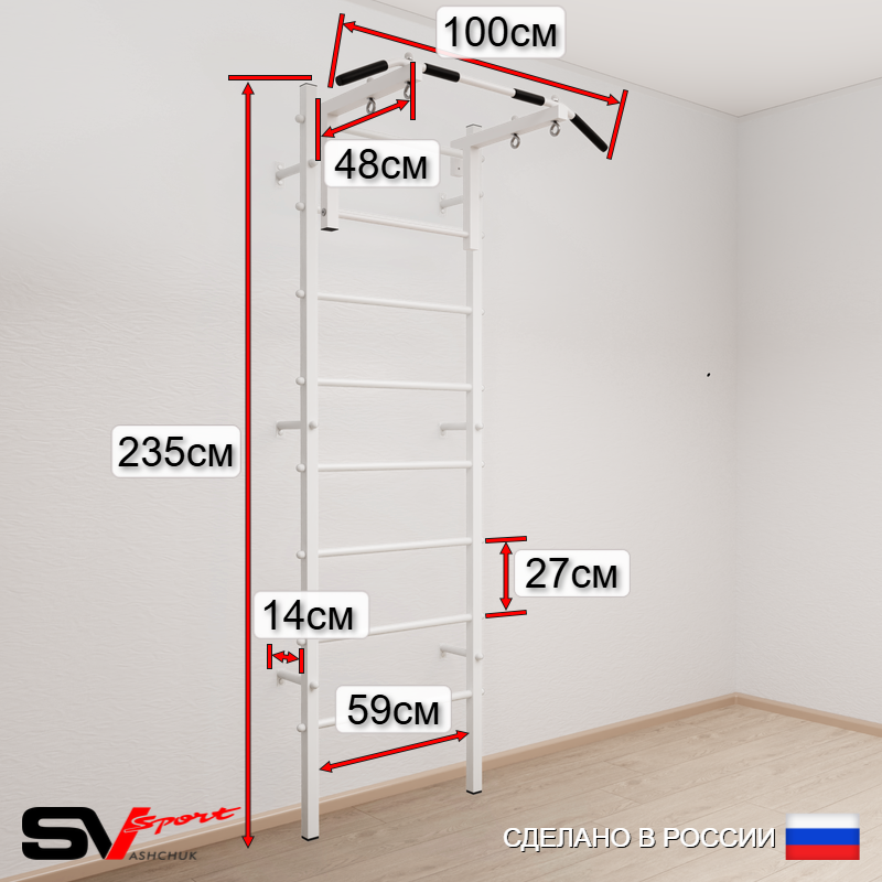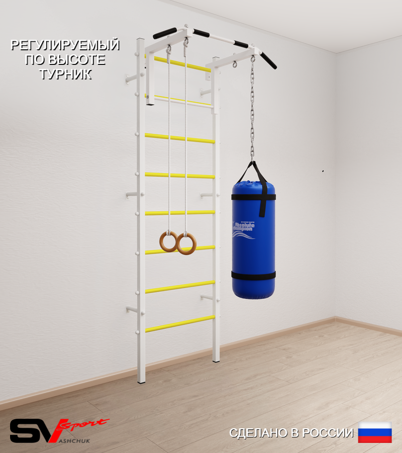 КОМПЛЕКТАЦИЯ: Шведская стенка Sv Sport усиленная (профиль вертикальных стоек 60 х 40 х 2 мм), Турник Sv Sport стандарт к ШС, Kольца деревянные, Цепь удлинитель 90см, Мешок боксерский 30кг.