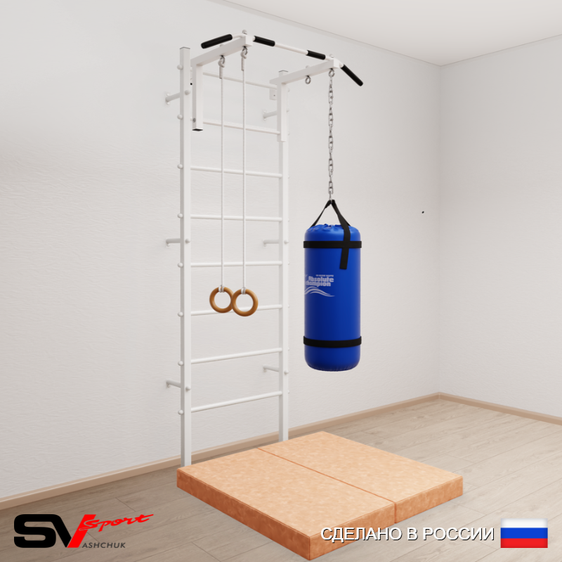 КОМПЛЕКТАЦИЯ: Шведская стенка Sv Sport усиленная (профиль вертикальных стоек 60 х 40 х 2 мм), Турник Sv Sport стандарт к ШС, Kольца деревянные, Цепь удлинитель 90см, Мешок боксерский 30кг, Спортивный мат 100 х 100 х 10 см складной.