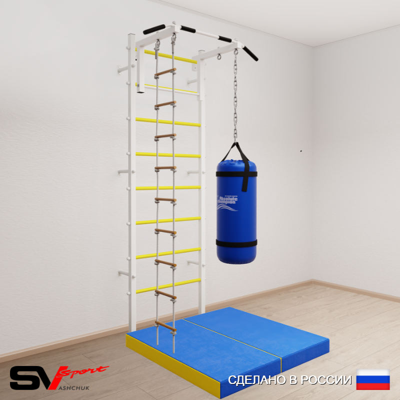 КОМПЛЕКТАЦИЯ: Шведская стенка Sv Sport усиленная (профиль вертикальных стоек 60 х 40 х 2 мм), Турник Sv Sport стандарт к ШС, Лестница веревочная, Цепь удлинитель 90см, Мешок боксерский 22кг, Спортивный мат 100 х 100 х 10 см складной.