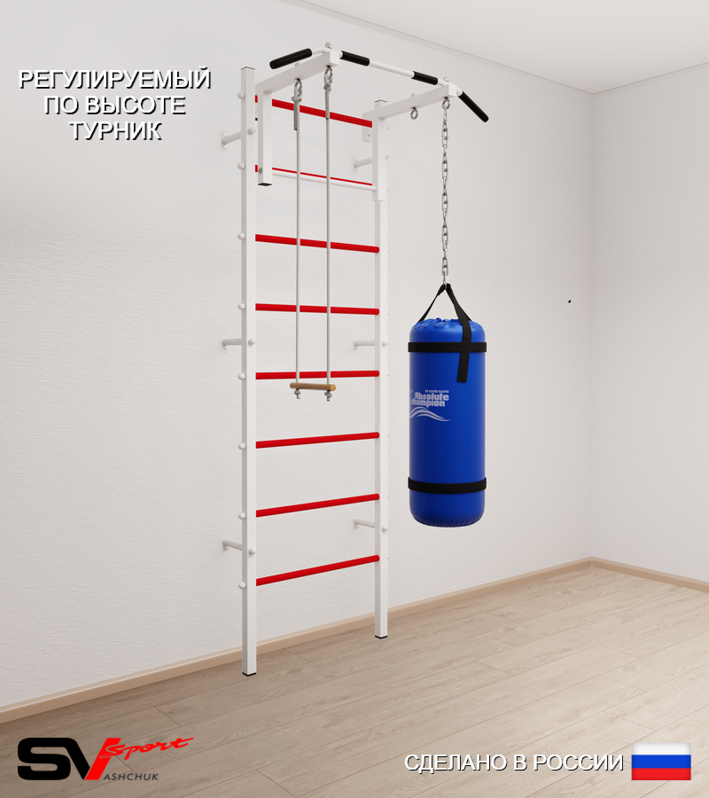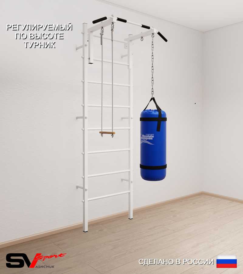 КОМПЛЕКТАЦИЯ: Шведская стенка Sv Sport усиленная (профиль вертикальных стоек 60 х 40 х 2 мм), Турник Sv Sport стандарт к ШС, Трапеция, Цепь удлинитель 90см, Мешок боксерский 30кг.