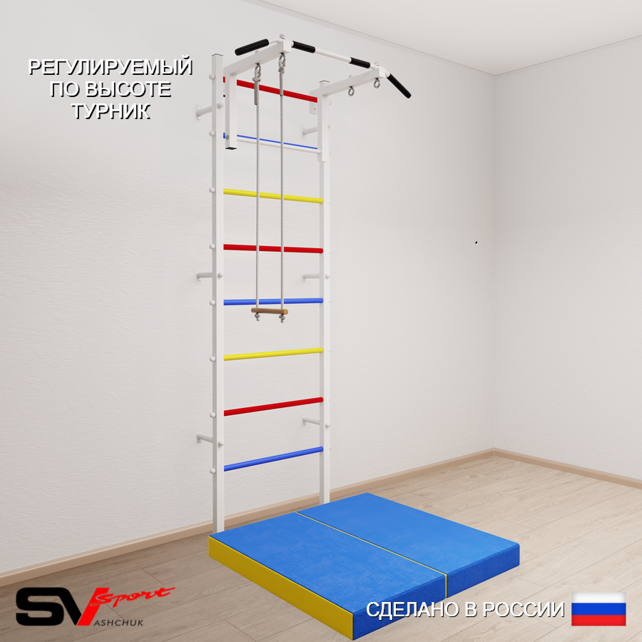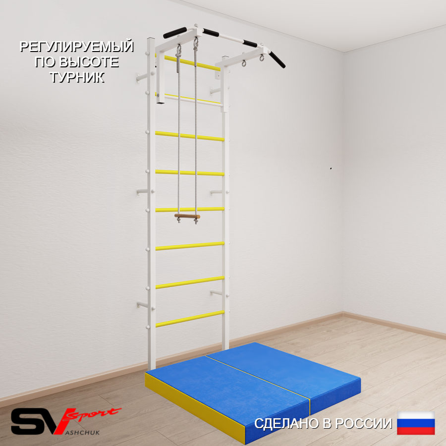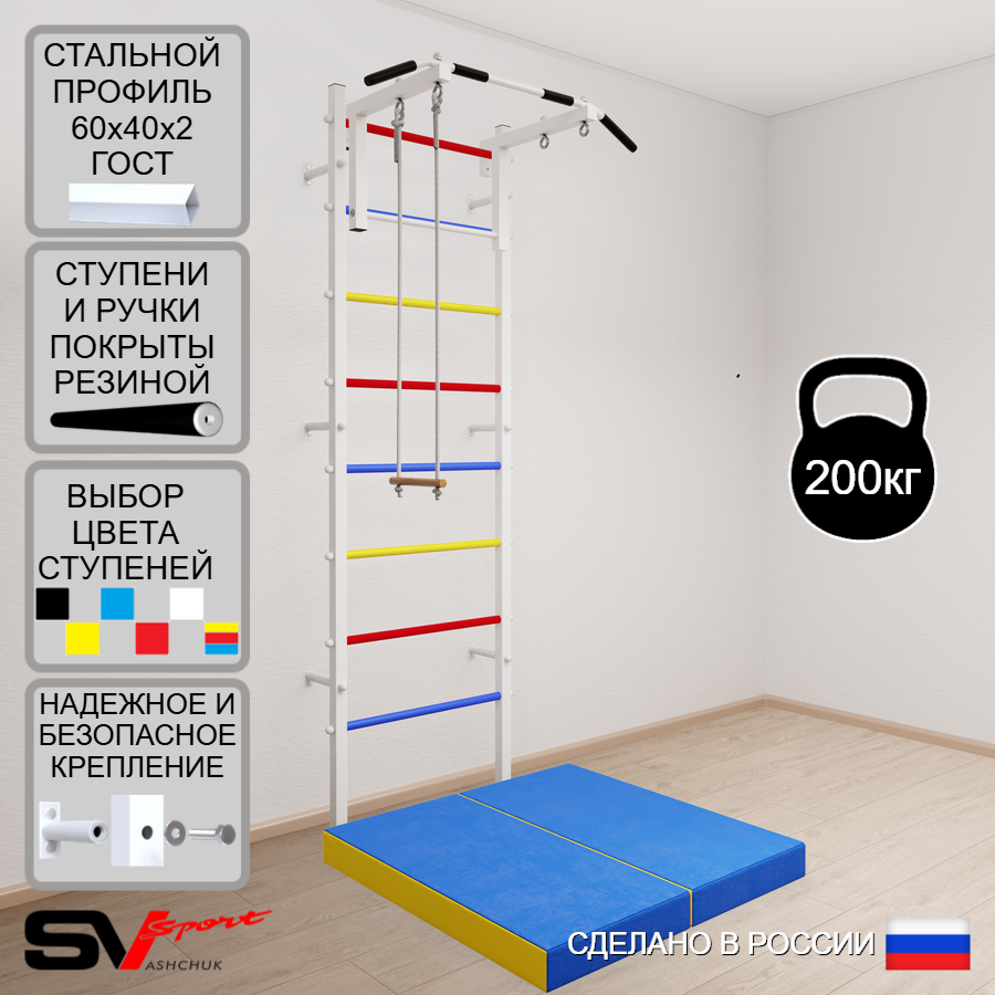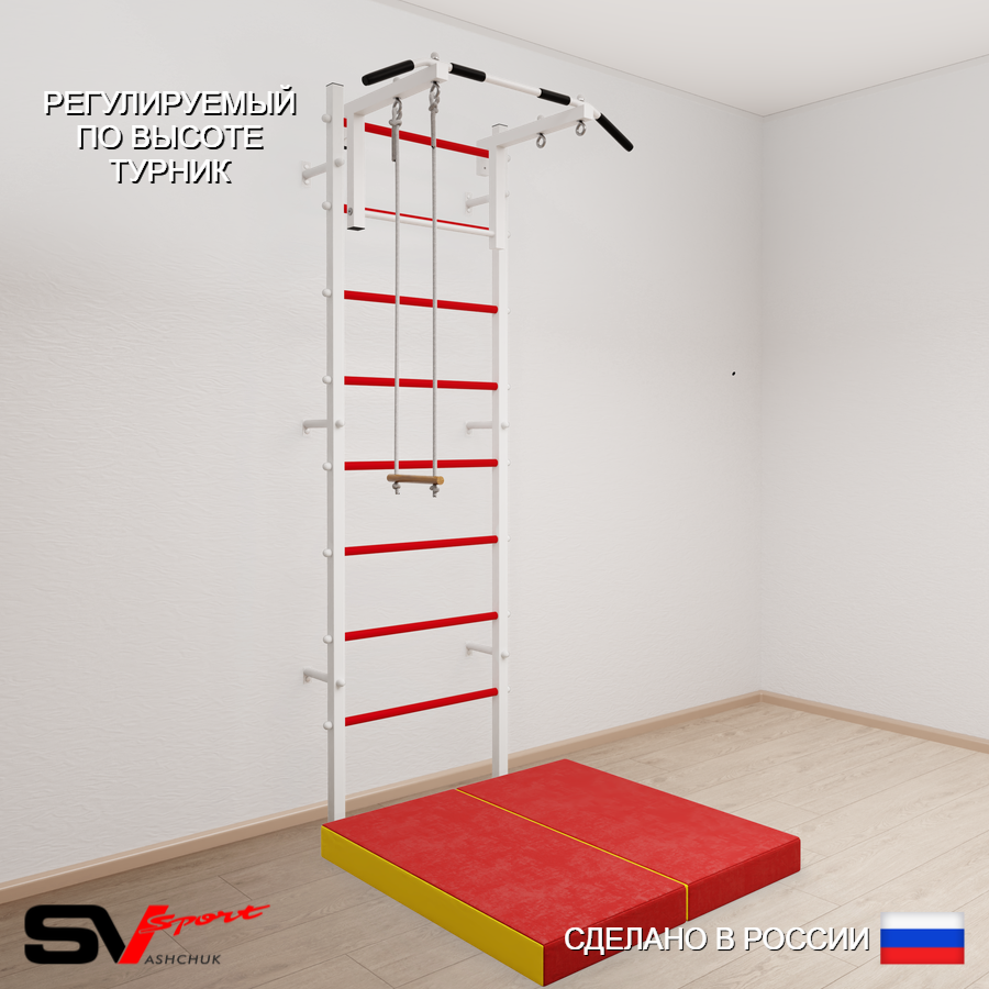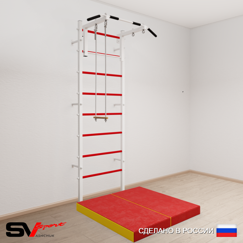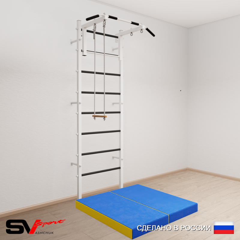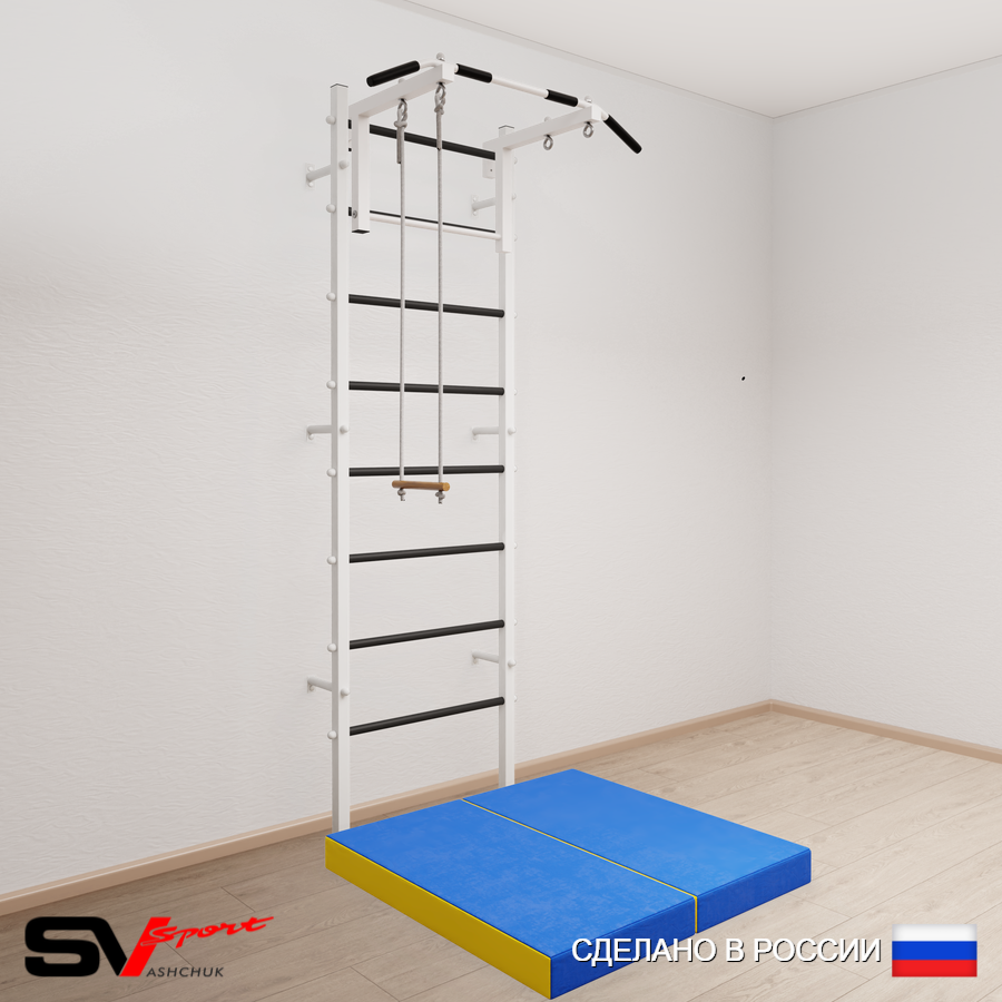 КОМПЛЕКТАЦИЯ: Шведская стенка Sv Sport усиленная (профиль вертикальных стоек 60 х 40 х 2 мм), Турник Sv Sport стандарт к ШС, Трапеция, Спортивный мат 100 х 100 х 10 см складной.