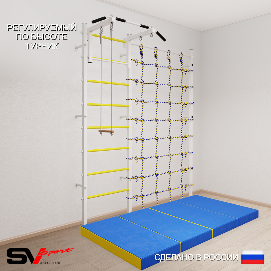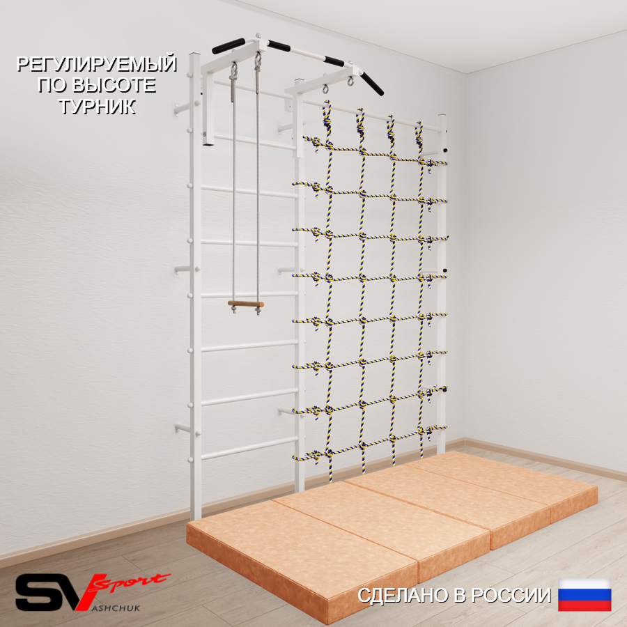 КОМПЛЕКТАЦИЯ: Шведская стенка Sv Sport усиленная (профиль вертикальных стоек 60 х 40 х 2 мм), Турник Sv Sport стандарт к ШС, Трапеция, Спортивный мат 100 х 200 х 10 см складной, Канатный лаз.