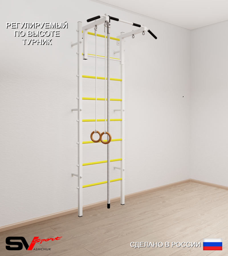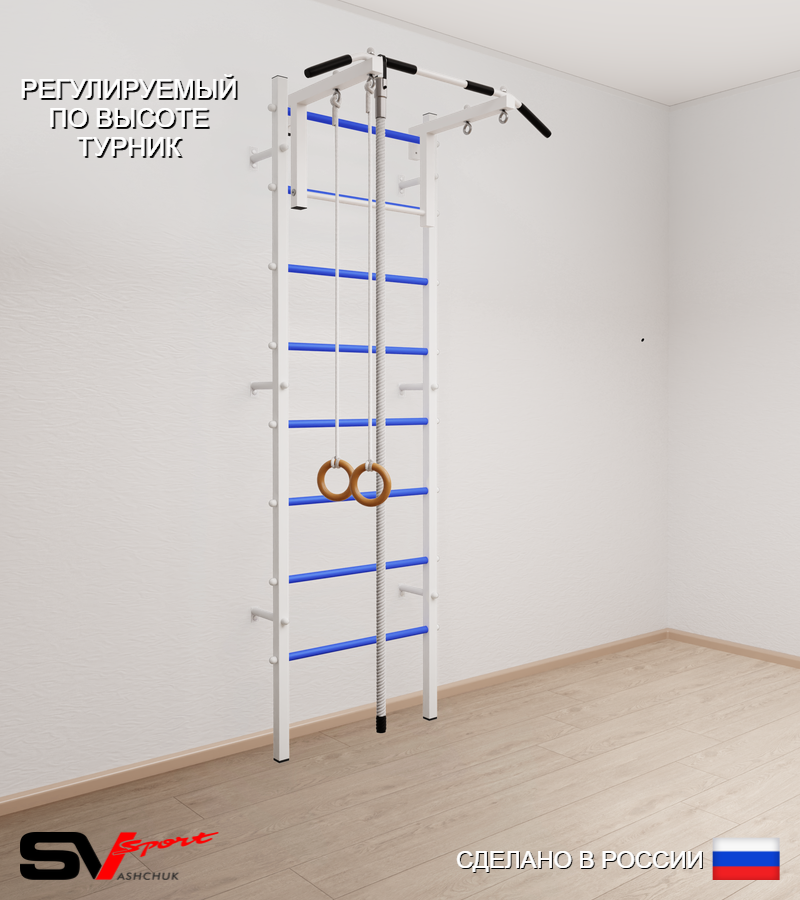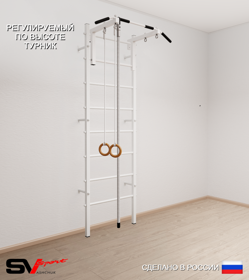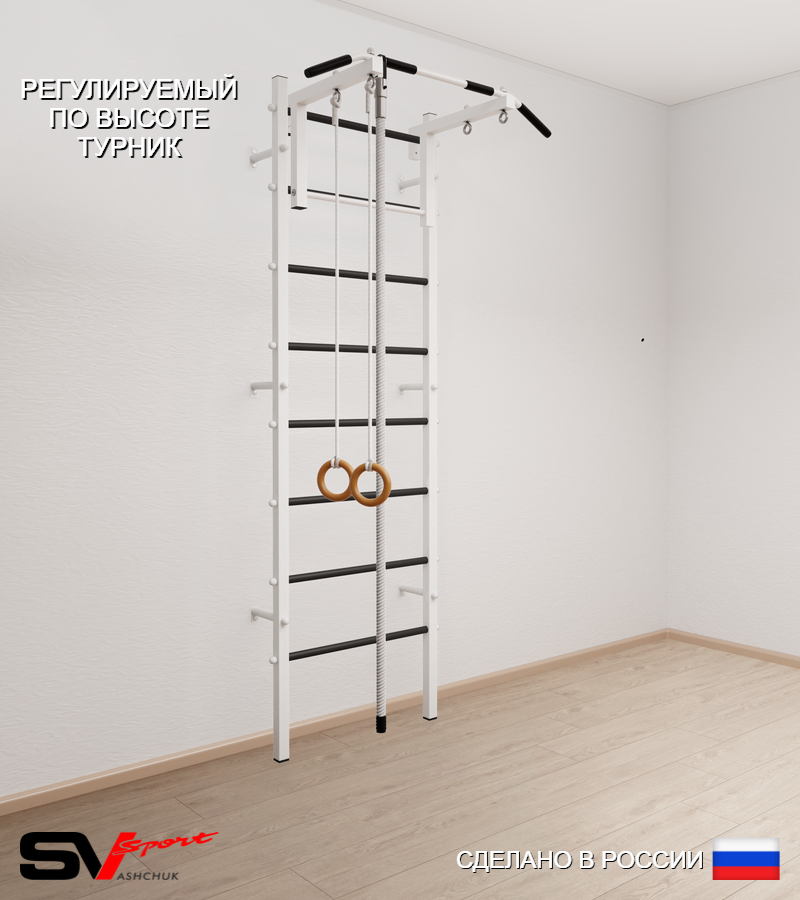 КОМПЛЕКТАЦИЯ: Шведская стенка Sv Sport усиленная (профиль вертикальных стоек 60 х 40 х 2 мм), Турник Sv Sport стандарт к ШС, Kанат, Kольца деревянные.