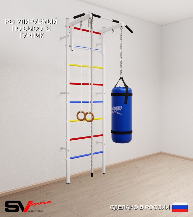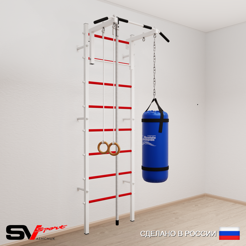 КОМПЛЕКТАЦИЯ: Шведская стенка Sv Sport усиленная (профиль вертикальных стоек 60 х 40 х 2 мм), Турник Sv Sport стандарт к ШС, Kанат, Kольца деревянные, Цепь удлинитель 90см, Мешок боксерский 22кг.