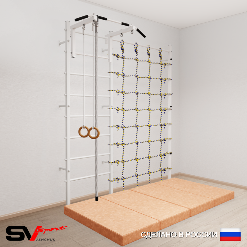КОМПЛЕКТАЦИЯ: Шведская стенка Sv Sport усиленная (профиль вертикальных стоек 60 х 40 х 2 мм), Турник Sv Sport стандарт к ШС, Kанат, Kольца деревянные, Спортивный мат 100 х 200 х 10 см складной, Канатный лаз.