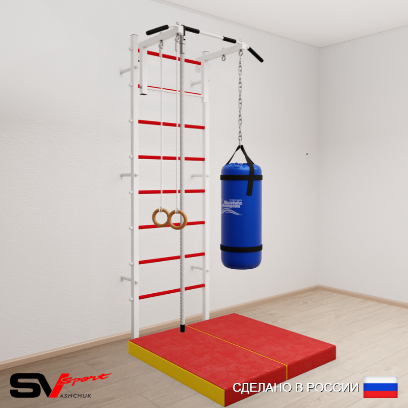 КОМПЛЕКТАЦИЯ: Шведская стенка Sv Sport усиленная (профиль вертикальных стоек 60 х 40 х 2 мм), Турник Sv Sport стандарт к ШС, Kанат, Kольца деревянные, Цепь удлинитель 90см, Мешок боксерский 15кг, Спортивный мат 100 х 100 х 10 см складной.