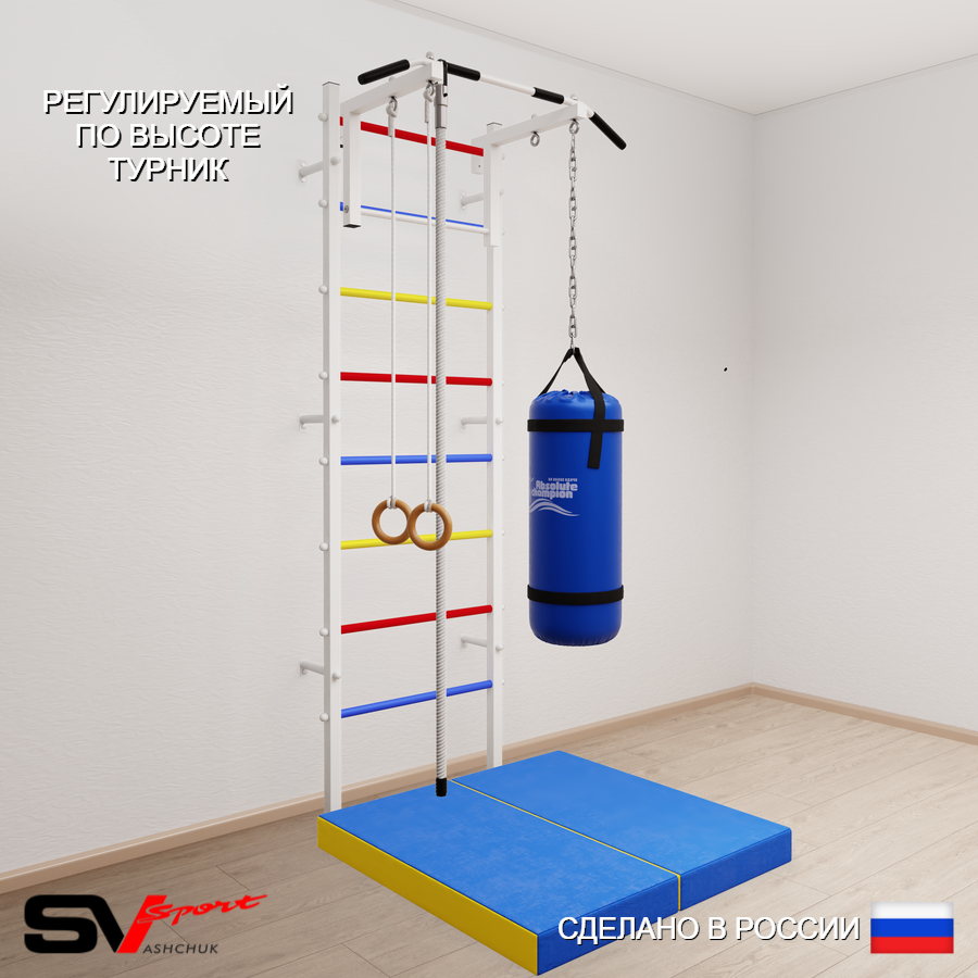КОМПЛЕКТАЦИЯ: Шведская стенка Sv Sport усиленная (профиль вертикальных стоек 60 х 40 х 2 мм), Турник Sv Sport стандарт к ШС, Kанат, Kольца деревянные, Цепь удлинитель 90см, Мешок боксерский 30кг, Спортивный мат 100 х 100 х 10 см складной.