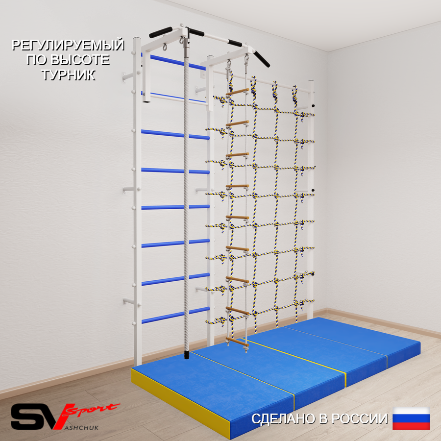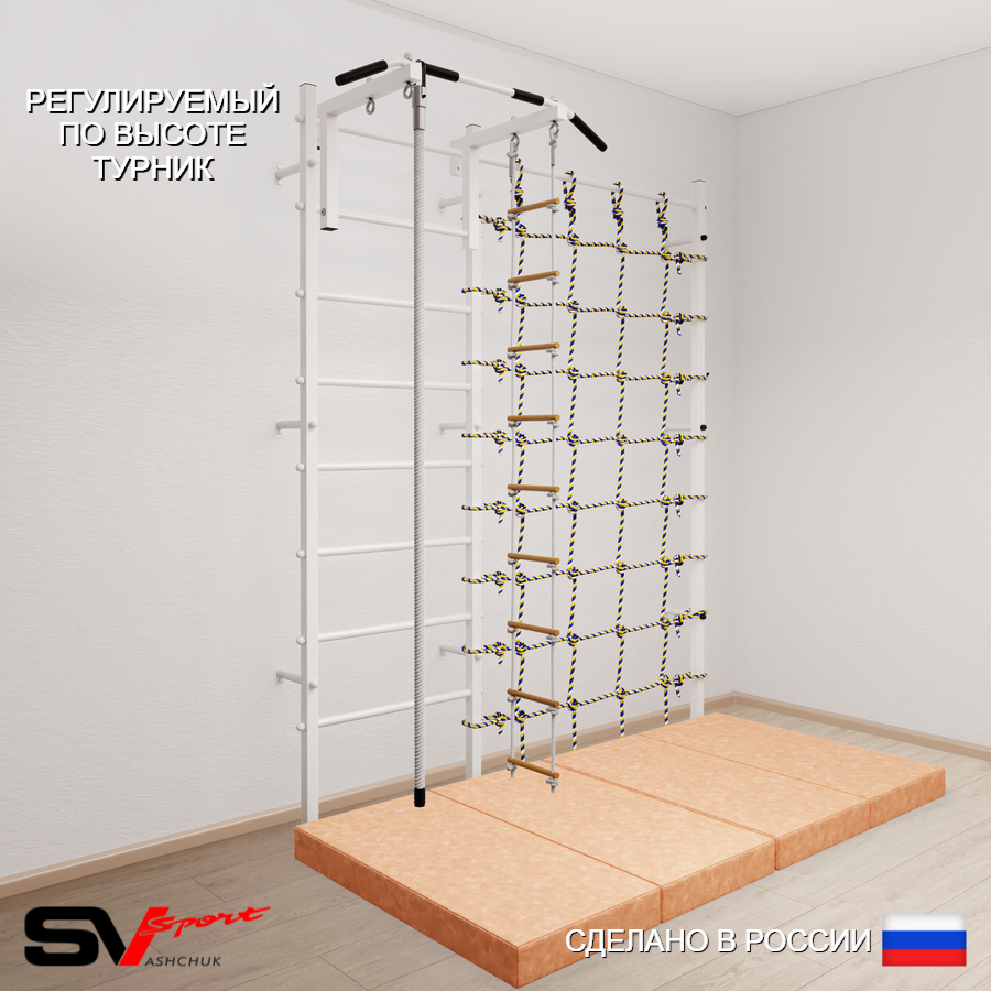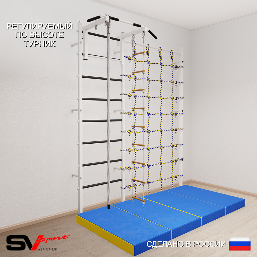 КОМПЛЕКТАЦИЯ: Шведская стенка Sv Sport усиленная (профиль вертикальных стоек 60 х 40 х 2 мм), Турник Sv Sport стандарт к ШС, Kанат, Лестница веревочная, Спортивный мат 100 х 200 х 10 см складной, Канатный лаз.