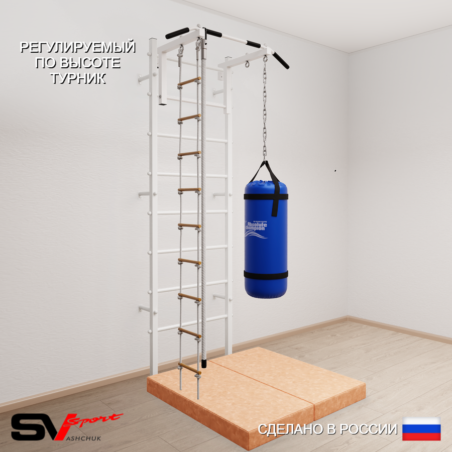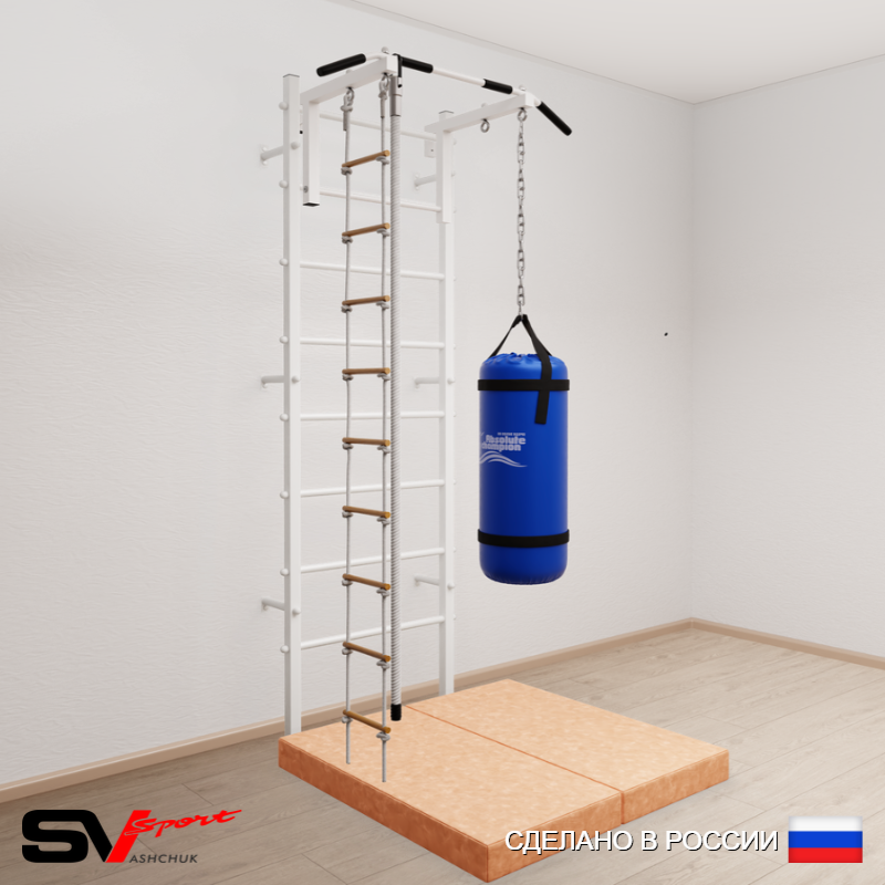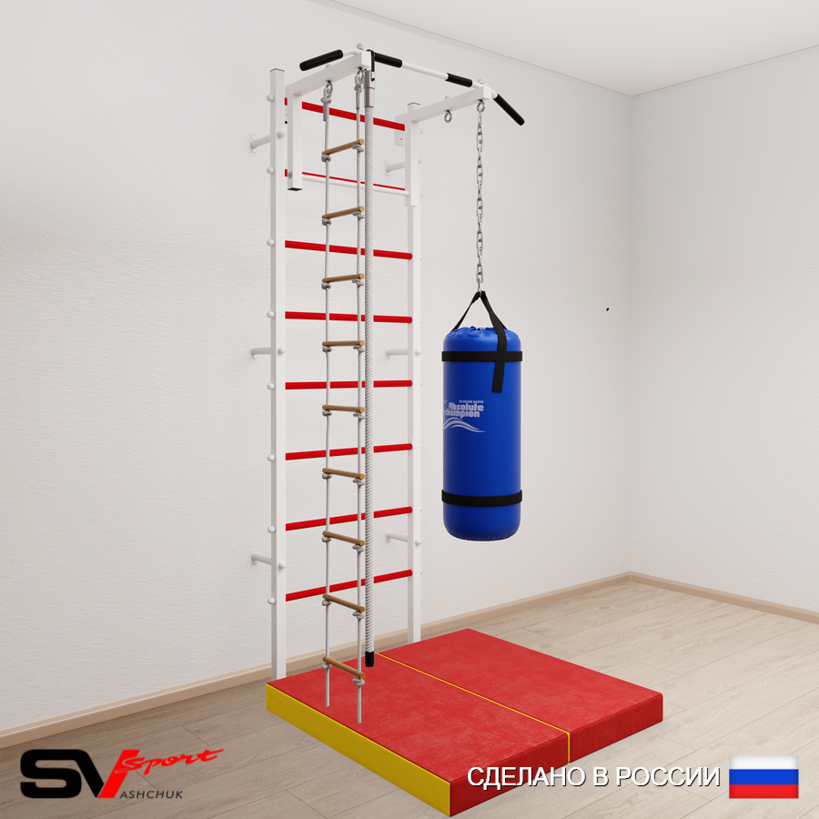 КОМПЛЕКТАЦИЯ: Шведская стенка Sv Sport усиленная (профиль вертикальных стоек 60 х 40 х 2 мм), Турник Sv Sport стандарт к ШС, Kанат, Лестница веревочная, Цепь удлинитель 90см, Мешок боксерский 22кг, Спортивный мат 100 х 100 х 10 см складной.