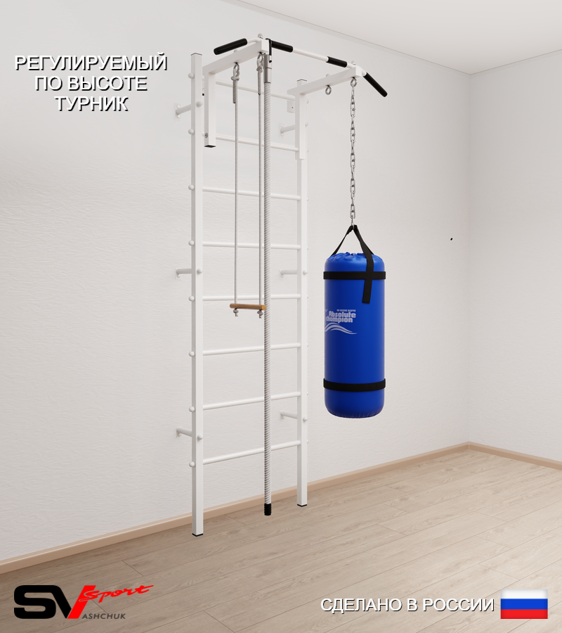 КОМПЛЕКТАЦИЯ: Шведская стенка Sv Sport усиленная (профиль вертикальных стоек 60 х 40 х 2 мм), Турник Sv Sport стандарт к ШС, Kанат, Трапеция, Цепь удлинитель 90см, Мешок боксерский 22кг.