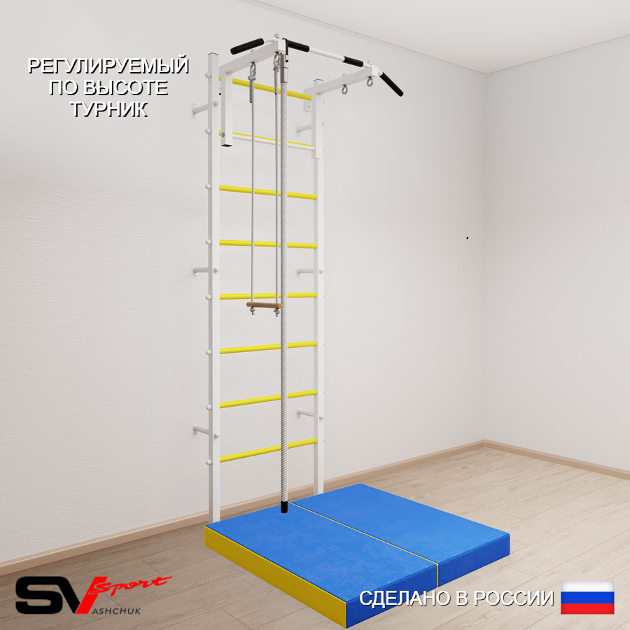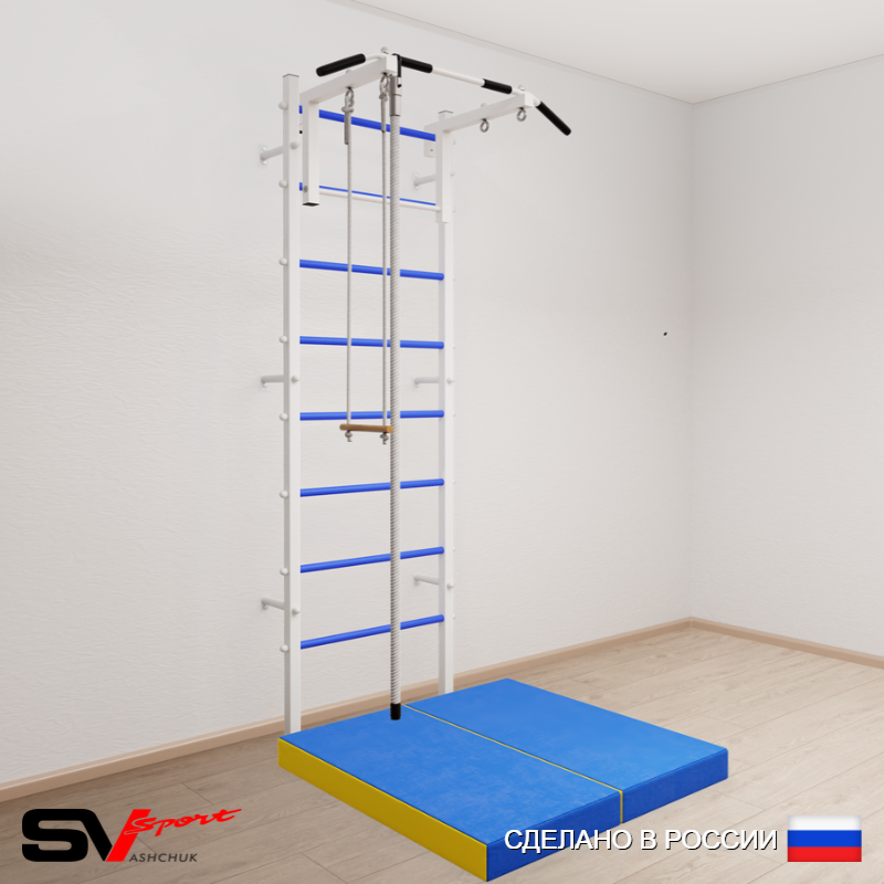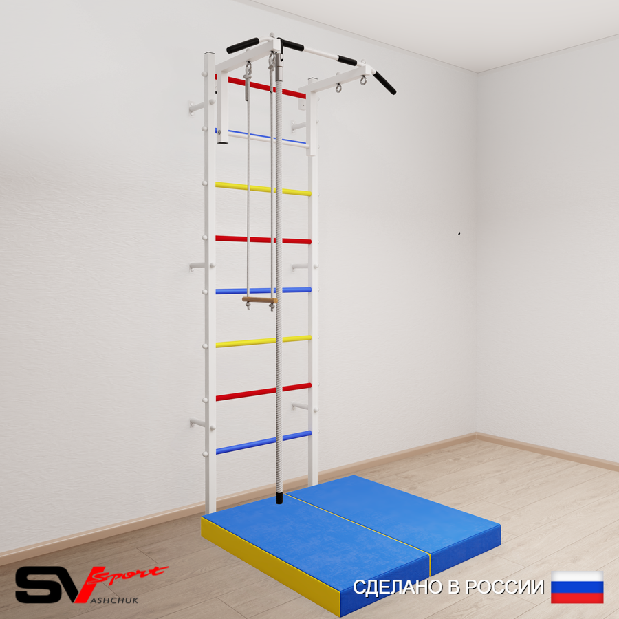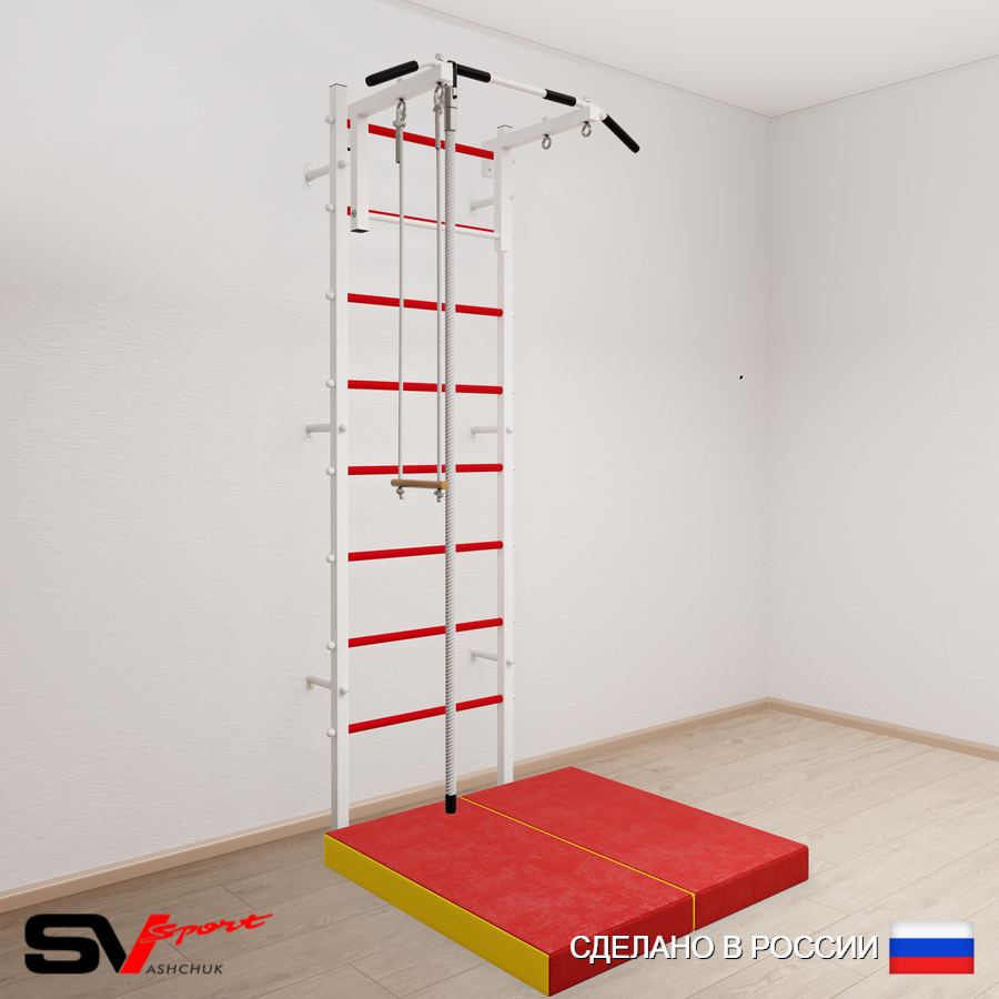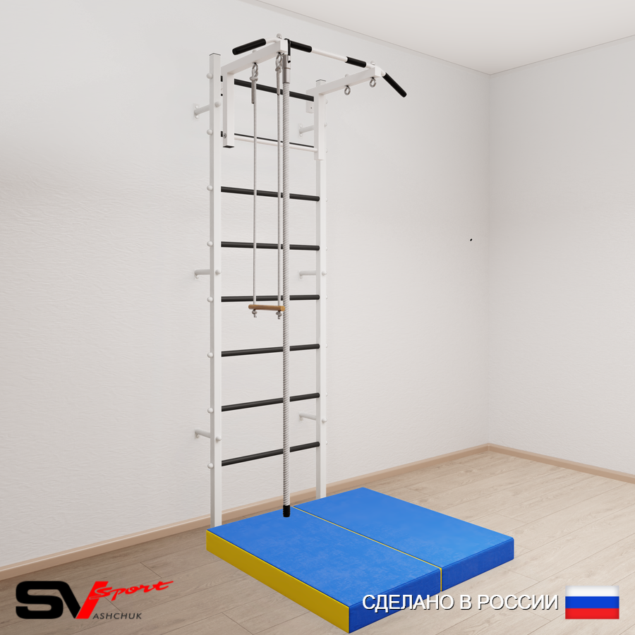 КОМПЛЕКТАЦИЯ: Шведская стенка Sv Sport усиленная (профиль вертикальных стоек 60 х 40 х 2 мм), Турник Sv Sport стандарт к ШС, Kанат, Трапеция, Спортивный мат 100 х 100 х 10 см складной.