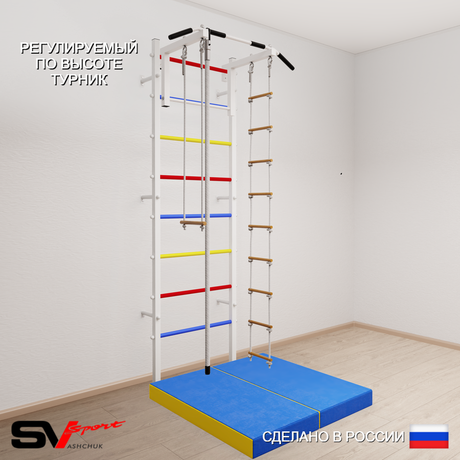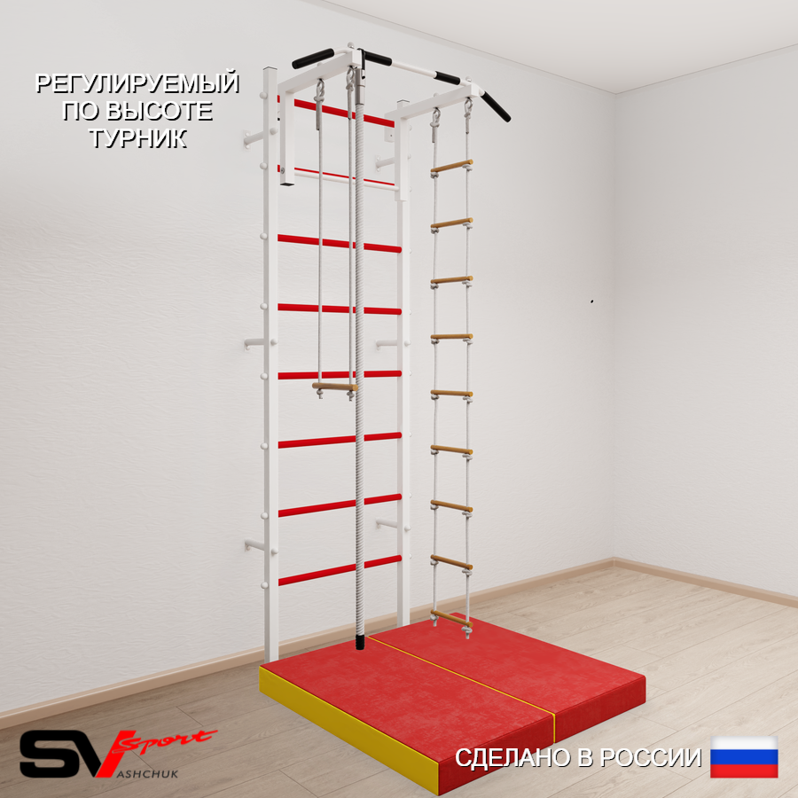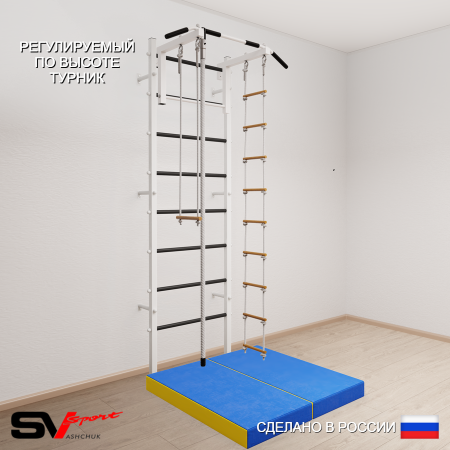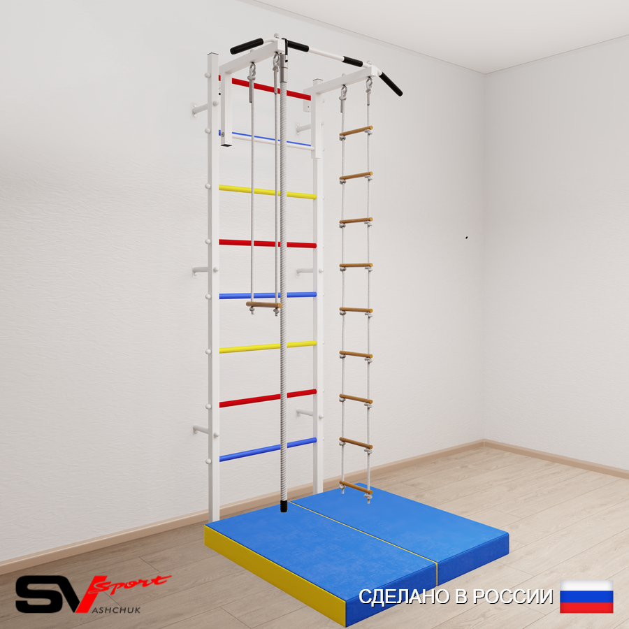 КОМПЛЕКТАЦИЯ: Шведская стенка Sv Sport усиленная (профиль вертикальных стоек 60 х 40 х 2 мм), Турник Sv Sport стандарт к ШС, Kанат, Трапеция, Лестница веревочная, Спортивный мат 100 х 100 х 10 см складной.