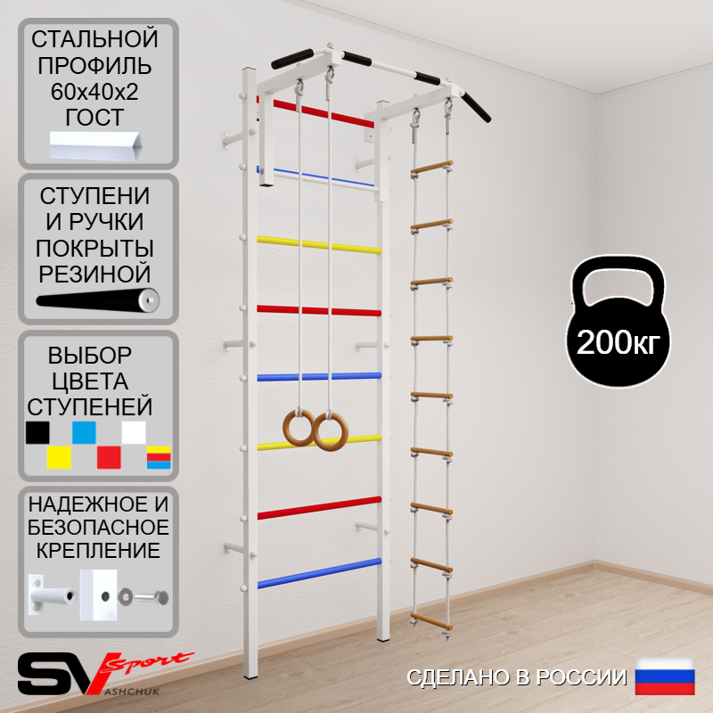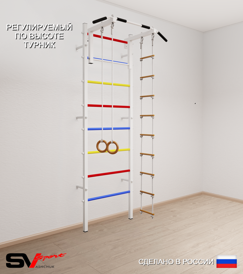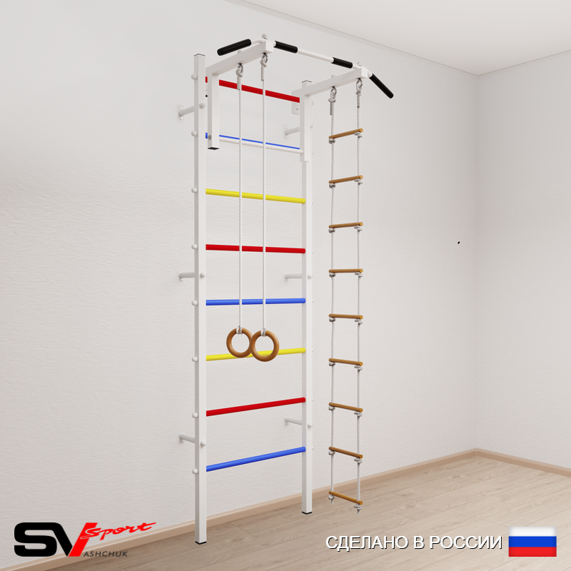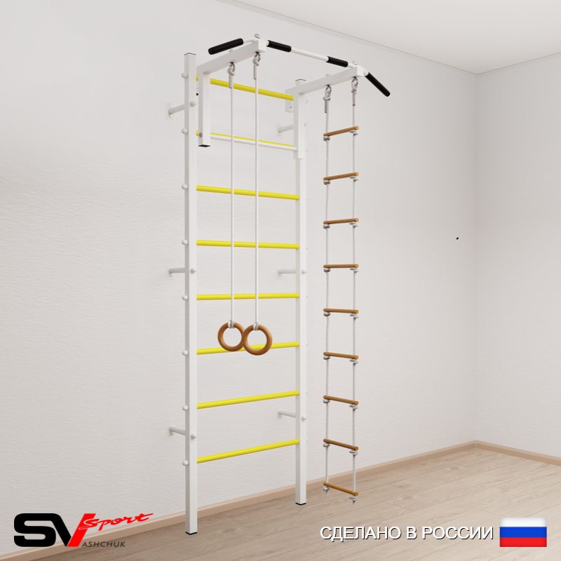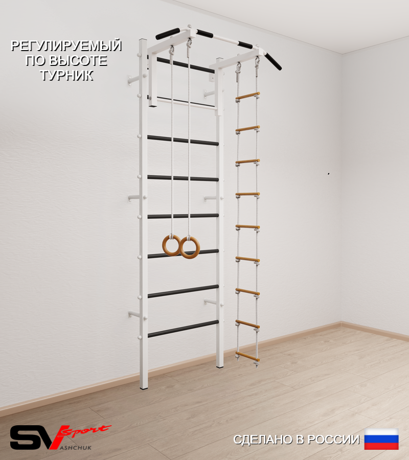 КОМПЛЕКТАЦИЯ: Шведская стенка Sv Sport усиленная (профиль вертикальных стоек 60 х 40 х 2 мм), Турник Sv Sport стандарт к ШС, Kольца деревянные, Лестница веревочная.