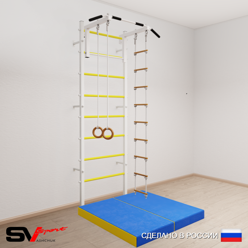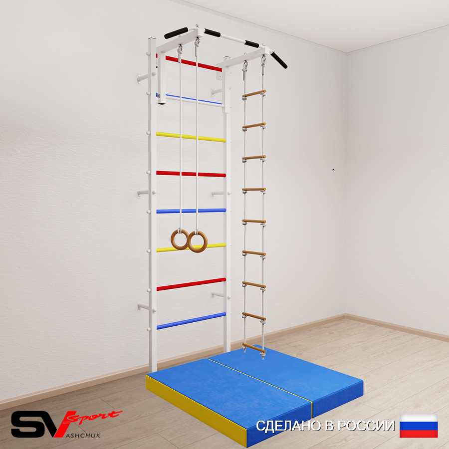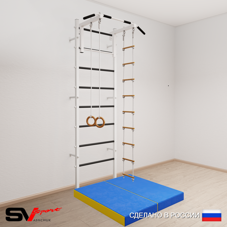 КОМПЛЕКТАЦИЯ: Шведская стенка Sv Sport усиленная (профиль вертикальных стоек 60 х 40 х 2 мм), Турник Sv Sport стандарт к ШС, Kольца деревянные, Лестница веревочная, Спортивный мат 100 х 100 х 10 см складной.