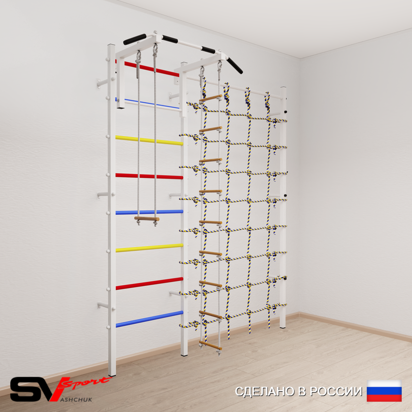 КОМПЛЕКТАЦИЯ: Шведская стенка Sv Sport усиленная (профиль вертикальных стоек 60 х 40 х 2 мм), Турник Sv Sport стандарт к ШС, Трапеция, Лестница веревочная, Канатный лаз.