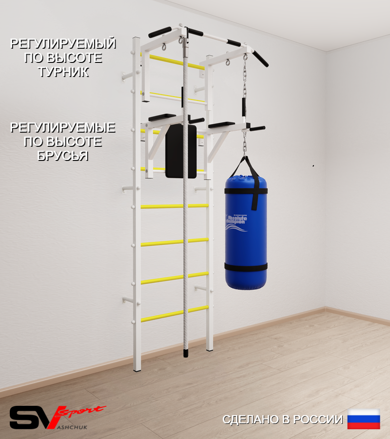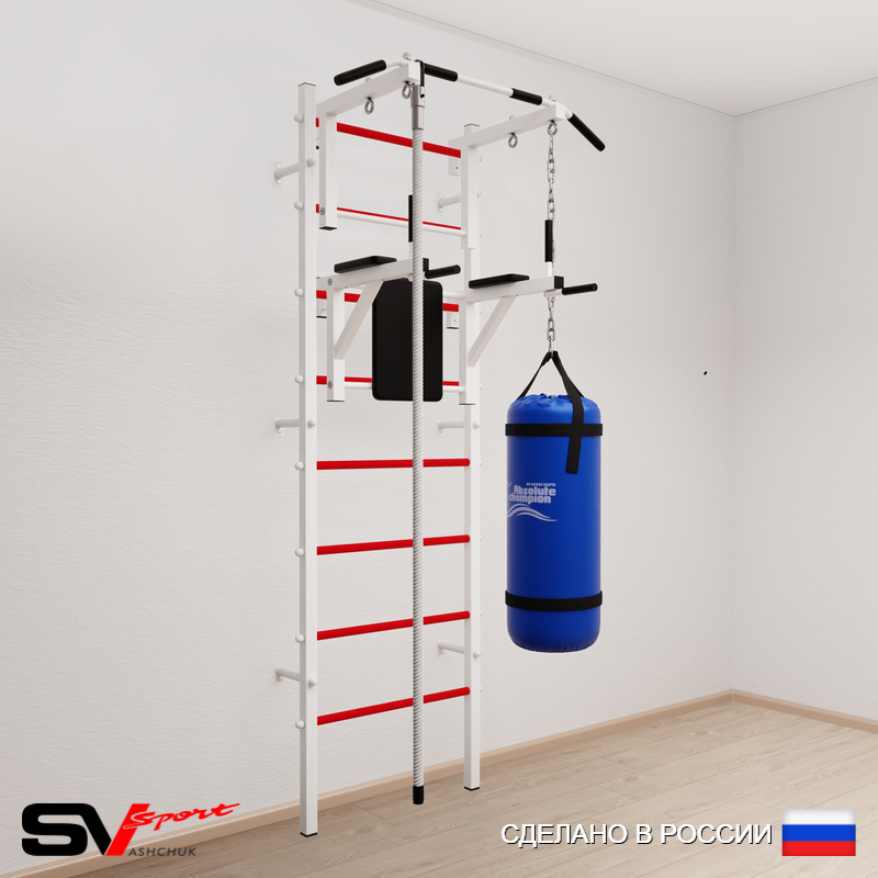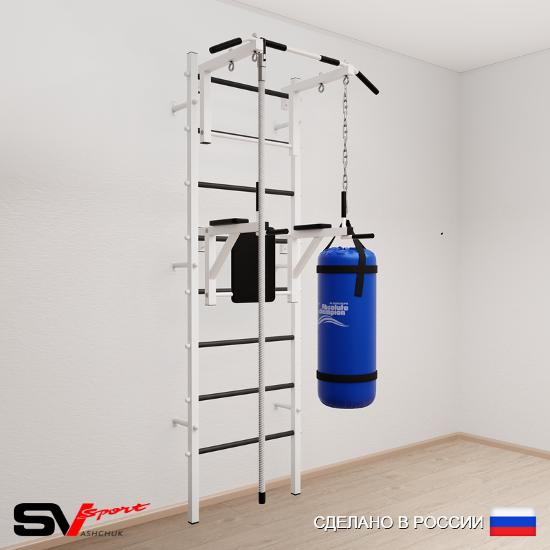 КОМПЛЕКТАЦИЯ: Шведская стенка Sv Sport усиленная (профиль вертикальных стоек 60 х 40 х 2 мм), Турник Sv Sport стандарт к ШС, Брусья Sv Sport к ШС, Kанат, Цепь удлинитель 90см, Мешок боксерский 22кг.