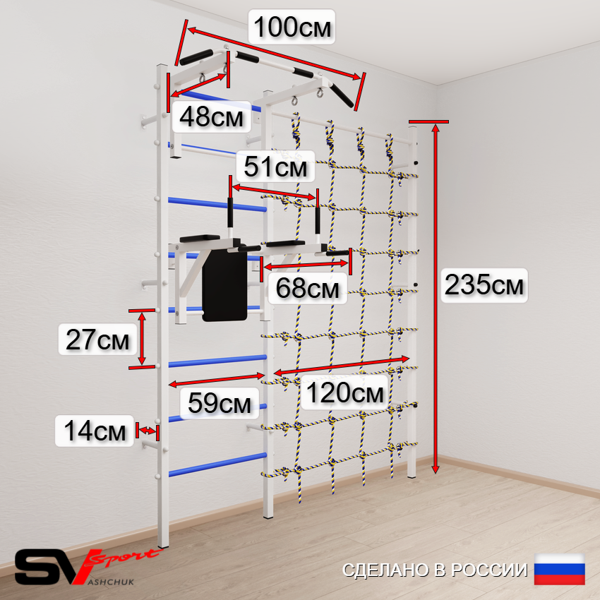 КОМПЛЕКТАЦИЯ: Шведская стенка Sv Sport усиленная (профиль вертикальных стоек 60 х 40 х 2 мм), Турник Sv Sport стандарт к ШС, Брусья Sv Sport к ШС, Kанат, Цепь удлинитель 90см, Мешок боксерский 30кг, Канатный лаз.