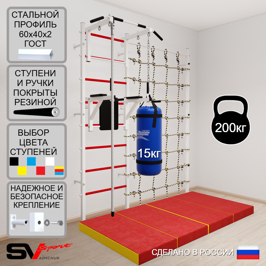 КОМПЛЕКТАЦИЯ: Шведская стенка Sv Sport усиленная (профиль вертикальных стоек 60 х 40 х 2 мм), Турник Sv Sport стандарт к ШС, Брусья Sv Sport к ШС, Kанат, Цепь удлинитель 90см, Мешок боксерский 15кг, Спортивный мат 100 х 200 х 10 см складной, Канатный лаз.