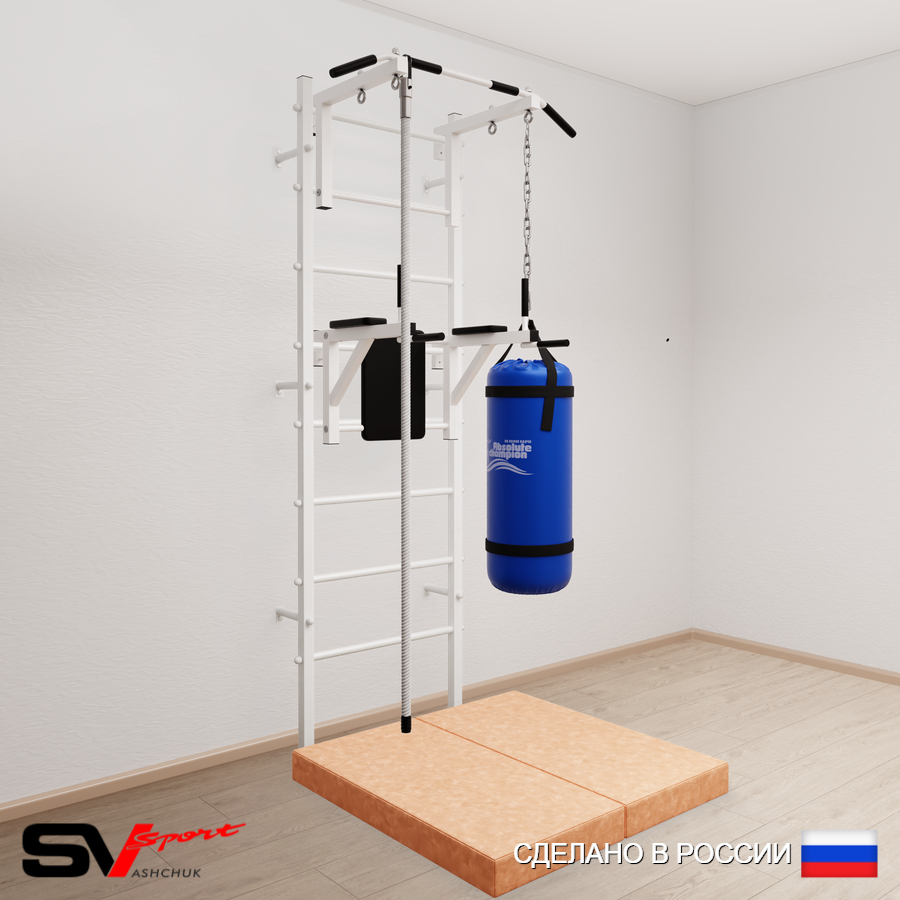 КОМПЛЕКТАЦИЯ: Шведская стенка Sv Sport усиленная (профиль вертикальных стоек 60 х 40 х 2 мм), Турник Sv Sport стандарт к ШС, Брусья Sv Sport к ШС, Kанат, Цепь удлинитель 90см, Мешок боксерский 22кг, Спортивный мат 100 х 100 х 10 см складной.