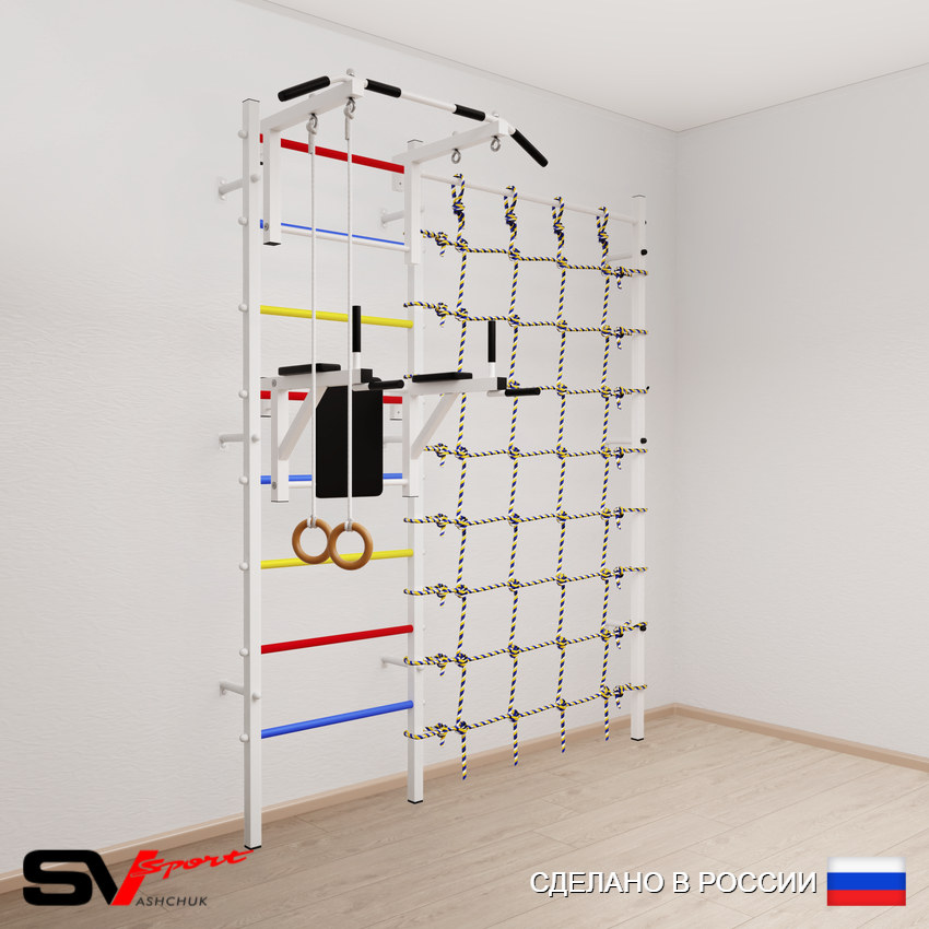 КОМПЛЕКТАЦИЯ: Шведская стенка Sv Sport усиленная (профиль вертикальных стоек 60 х 40 х 2 мм), Турник Sv Sport стандарт к ШС, Брусья Sv Sport к ШС, Kольца деревянные, Канатный лаз.